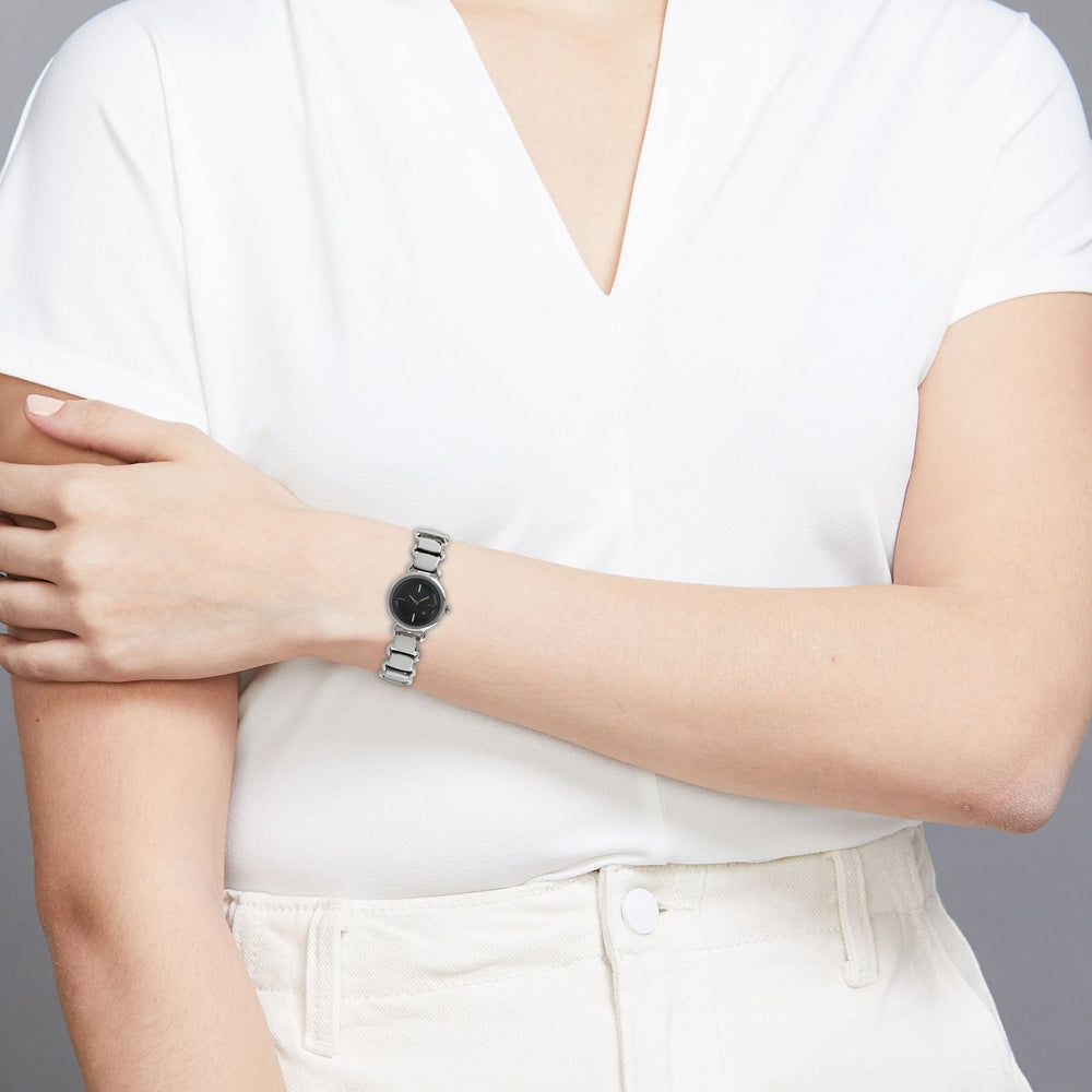 Embrace your feminine side with this elegant timepiece. The bold black dial is complemented by the subtle indices and plain hands which stand out. The beautiful bracelet elevates this feminine look even more. The serrated bezel takes the look of the watch up by several notches. Pair this watch with a floral dress and woo them with your femininity.