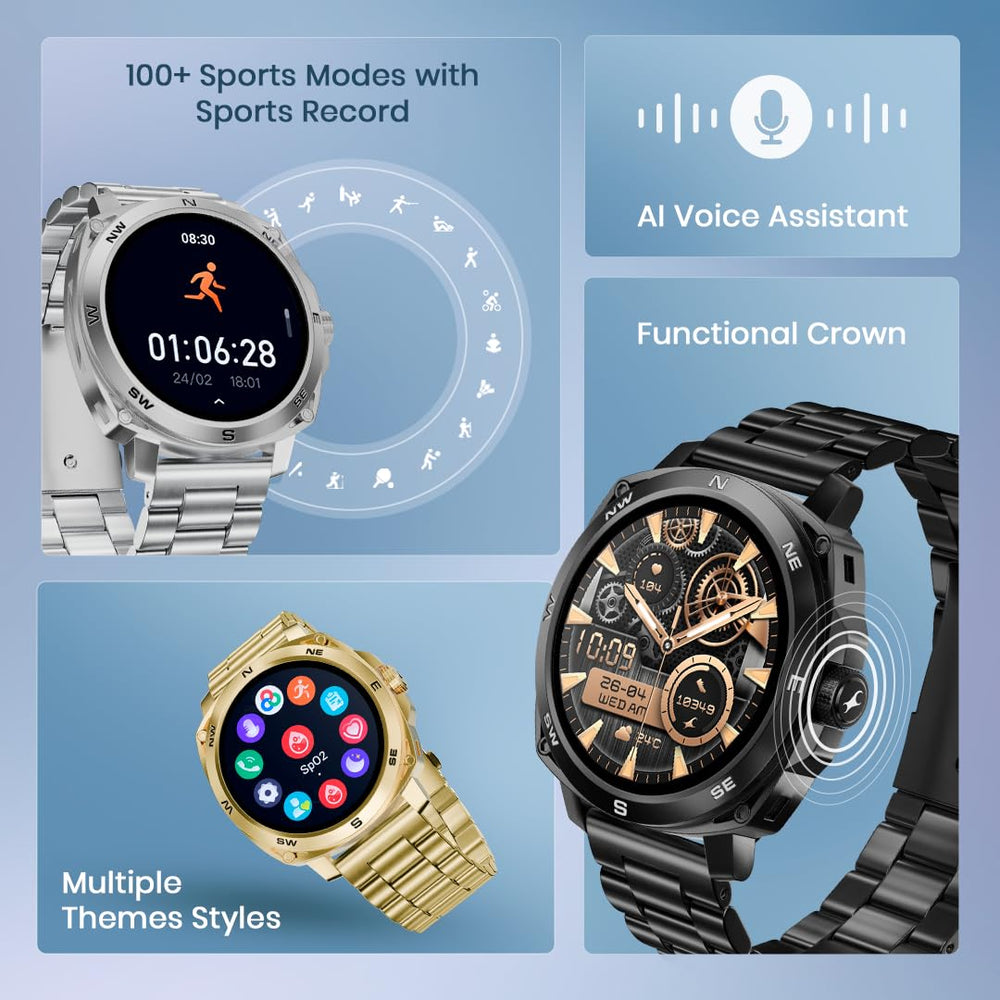3.63 CM AMOLED Display with 466x466 resolution for sharp visuals, equipped with a functional crown for easy navigation.Single Sync BT Calling and auto stress monitor, alongside comprehensive health tracking including SpO2, 24/7 heart rate monitoring, sleep monitor with REM, and women’s health features.Wellness features like sports records, breathe exercise, and productivity tools such as calculator and calendar.Smart functionalities include AI Voice Assistant, Find Phone, Always-On Display (AOD), and power saving mode for enhanced convenience and battery management.Additional tools like alarm, stopwatch, timer, weather display, camera & music control, customizable sound & vibration settings, DND mode, and screen-on time