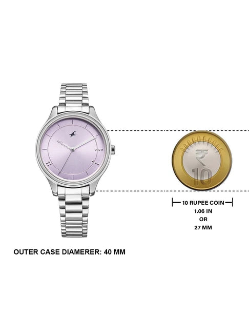 Designed to suit the preference of urban women, this analog watch watch from the collection by Fastrack is sure to make a style statement. Secured by a sapphire glass, the purple round dial is protected in a case. It exhibits crown for time adjustment. The stainless steel strap flaunts a silver hue that accentuates the look of the watch. Moreover, it is fitted with a Deployment Clasp clasp to ensure a secure fit on the wrist.