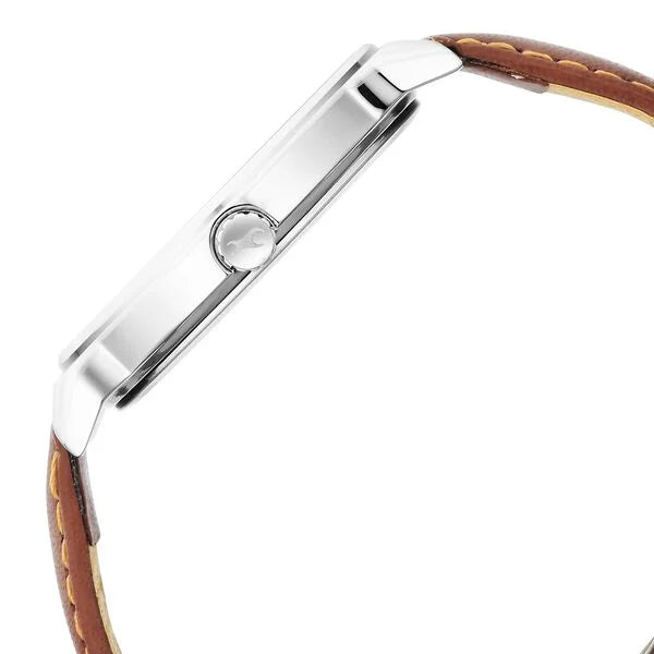 Spruce your ensemble with this analog watch showcasing a round dial, 50m water resistance, a leather strap, and a tang buckle closure.