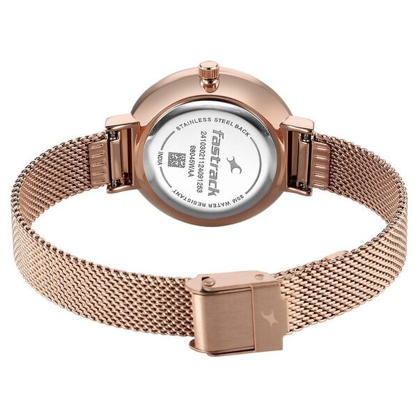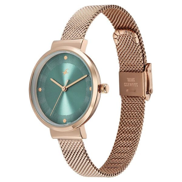 The stainless steel strap flaunts a rose gold hue that accentuates the look of the watch. Moreover, it is fitted with a deployment clasp to ensure a secure fit on the wrist.Designed to suit the preference of urban women, this watch from the collection by Fastrack is sure to make a style statement. Secured by a sapphire glass, the green round dial is protected in a case. It exhibits crown for time adjustment.