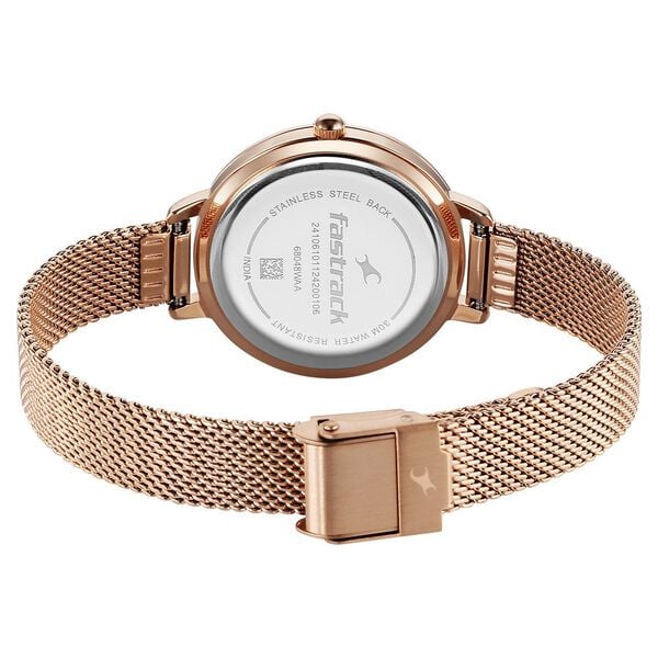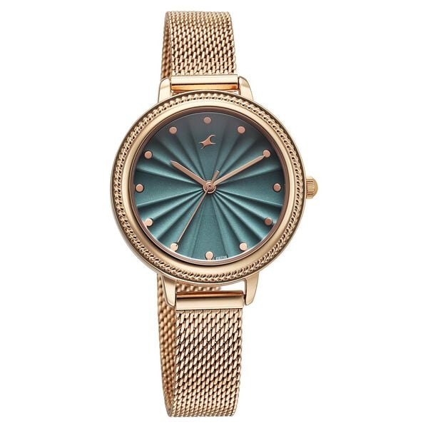 Designed to suit the preference of urban women, this watch from the collection by Fastrack is sure to make a style statement. Secured by a sapphire glass, the green round dial is protected in a case. It exhibits crown for time adjustment. The stainless steel strap flaunts a rose gold hue that accentuates the look of the watch. Moreover, it is fitted with a deployment clasp to ensure a secure fit on the wrist.