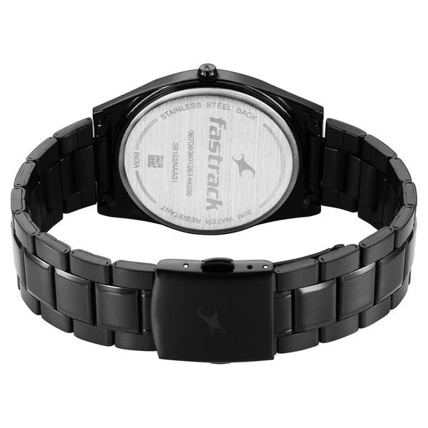 The stainless steel strap flaunts a black hue that accentuates the look of the watch. Moreover, it is fitted with a fold-over clasp with double push button safety clasp to ensure a secure fit on the wrist.Designed to suit the preference of urban men, this watch from the collection by Fastrack is sure to make a style statement. Secured by a sapphire glass, the olive round dial is protected in a case. It exhibits crown for time adjustment.