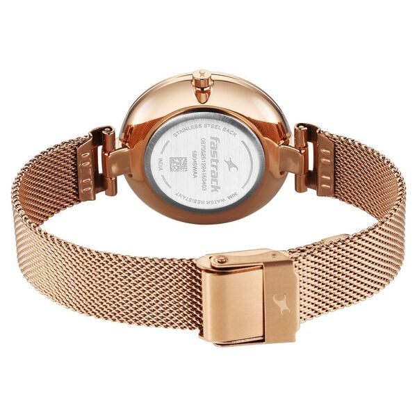 The stainless steel strap flaunts a rose gold hue that accentuates the look of the watch. Moreover, it is fitted with a deployment clasp to ensure a secure fit on the wrist.Designed to suit the preference of urban women, this watch from the collection by Fastrack is sure to make a style statement. Secured by a sapphire glass, the mother of pearl round dial is protected in a case. It exhibits crown for time adjustment