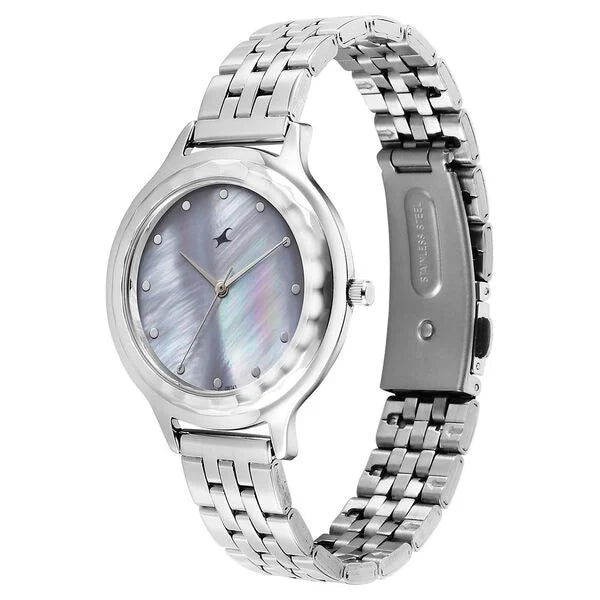 The stainless steel strap flaunts a silver hue that accentuates the look of the watch. Moreover, it is fitted with a fold-over clasp with double push button safety clasp to ensure a secure fit on the wristDesigned to suit the preference of urban women, this watch from the collection by Fastrack is sure to make a style statement. Secured by a sapphire glass, the mother of pearl round dial is protected in a case. It exhibits crown for time adjustment.