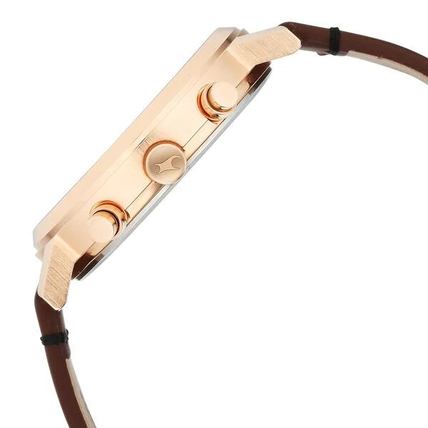 Add a stylish dimension to your look by wearing this men's analog watch from the Tick Tock collection by Fastrack. Exhibiting a white round-shaped dial, it displays multifunctionality. The elegant brown genuine leather strap with a buckle clasp makes it comfortable to wear. It has a dial diameter of 43 mm. It works on a quartz movement and is water resistant up to 50 m.