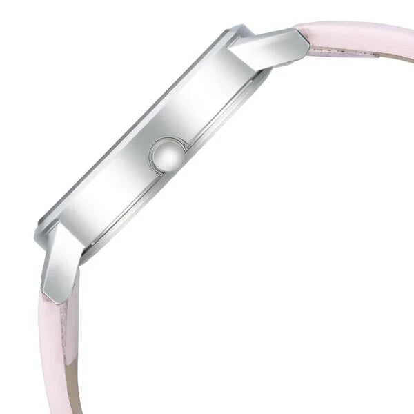 Step into a world of soft hues with this modern timepiece. This watch features a captivating pink dial with a dynamic, layered design showcasing a semicircular date display and a circular day indicator, adding a unique visual element. Sleek silver-toned hands glide across this contemporary landscape, complemented by minimalist indices. The smooth light pink leather strap completes this stylish and functional accessory with a touch of delicate charm