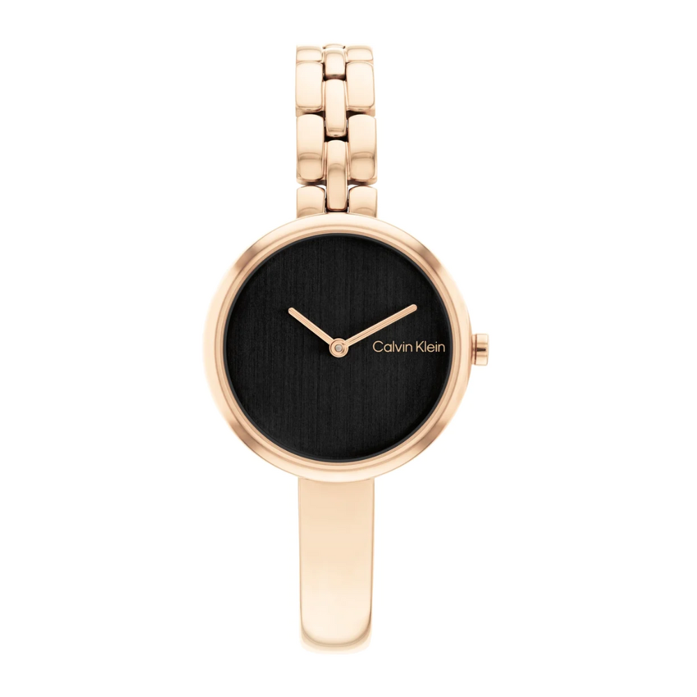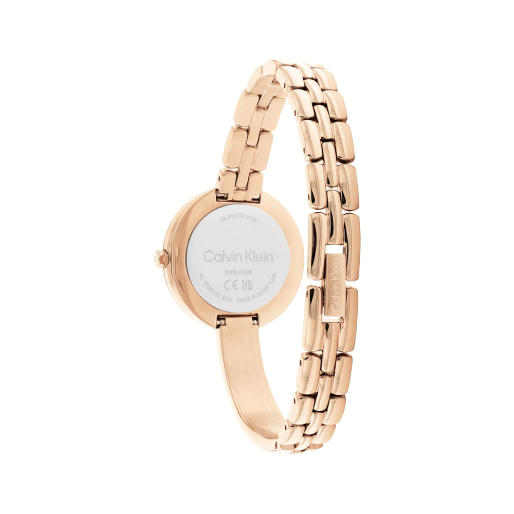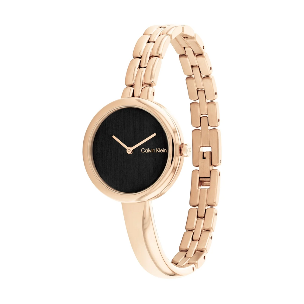 A Calvin Klein analog watch for the elegant female. Features a round stainless steel gold case of 28mm and a jewelry clasp for easy wear. Displays time via Quartz movement under a mineral lens. Perfect for casual wear. Requires a soft cloth for cleaning. Comes with a 2-year warranty. Made in USA.