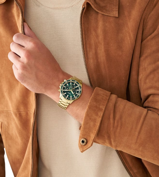 Look stylish and elegant by wearing this men's analog watch from FOSSIL. The green round dial is protected by a mineral glass. It has a crown for time adjustment. The stainless steel strap comes in a gold hue that further elevates the look of the timekeeper. Besides, it is completed with a double locking fold-over clasp to ensure a secure fit on the wrist.