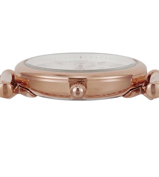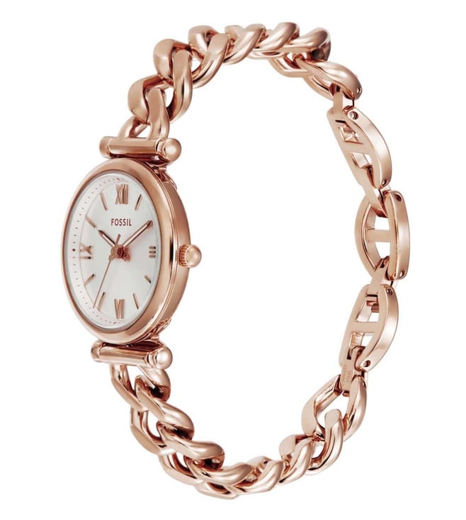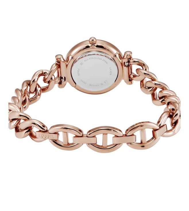 Elegance never goes out of style with this wristwatch from Fossil. It balances casual style with a hint of sophistication. With a redesigned '90s-inspired T-bar and stunning new bracelet design, it features a round 28 mm case and a sunray dial with luminous hands and Roman numeral and stick indices. The watch dial is protected with mineral glass and is water resistant up to 50 m.