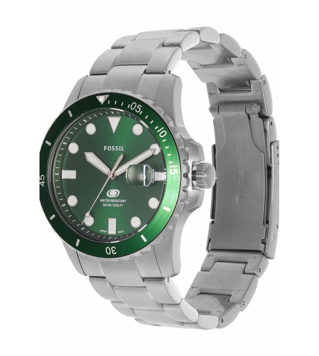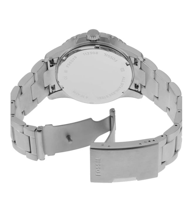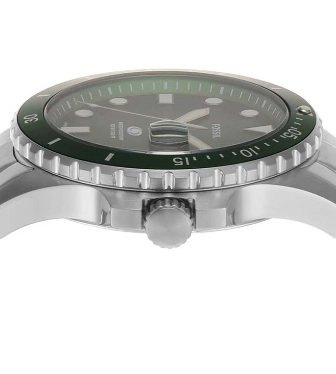 Make every second a memorable moment by donning this watch from the Dive collection by Fossil. Housed in a 42 mm case, the dial is shielded with mineral glass and runs on a quartz movement. It is water resistant up to 100 m and is ideally suitable for men. This dive-style timepiece is expertly crafted with a 3-link bracelet, geometric indices and a uni-directional rotating top ring.