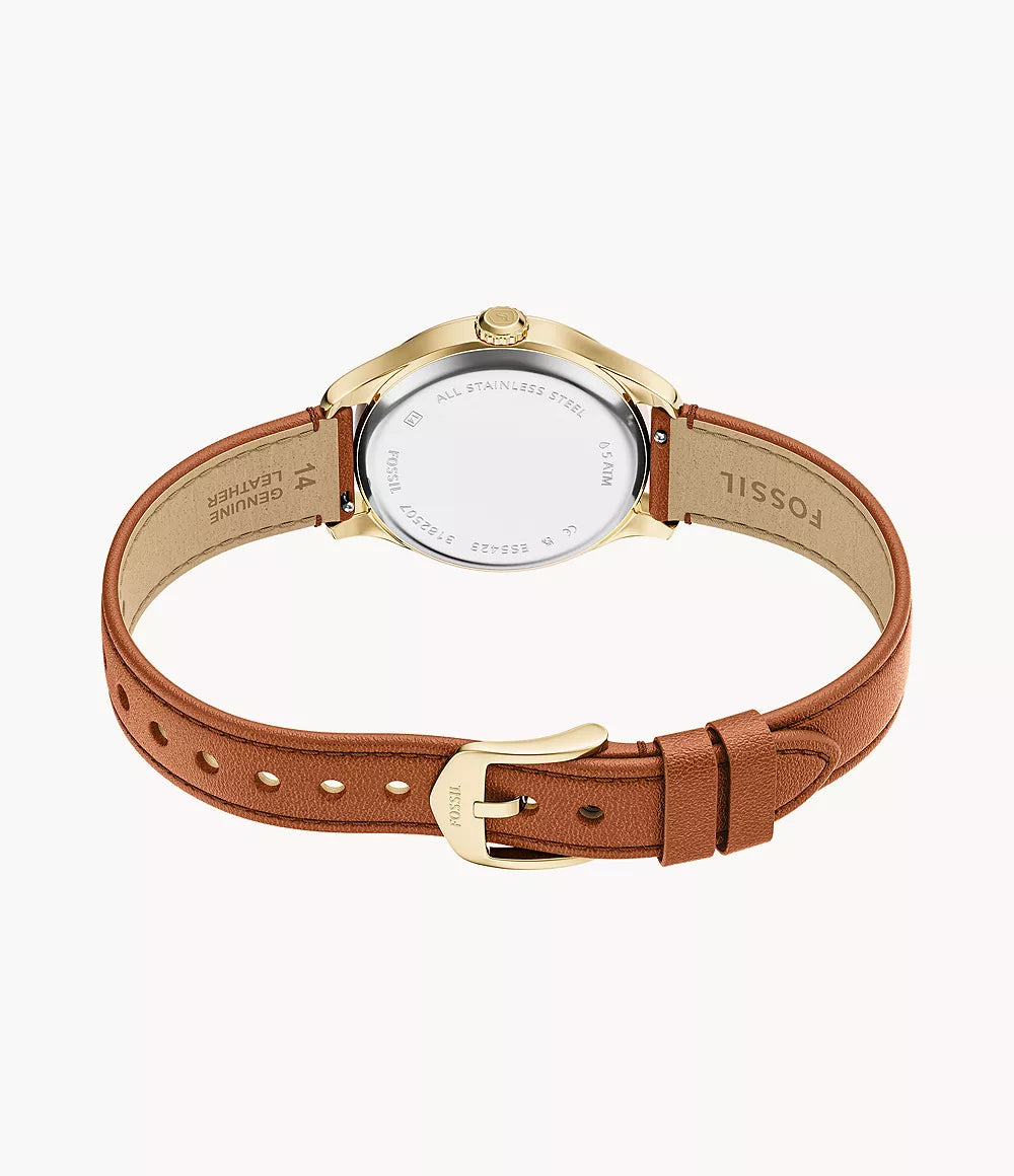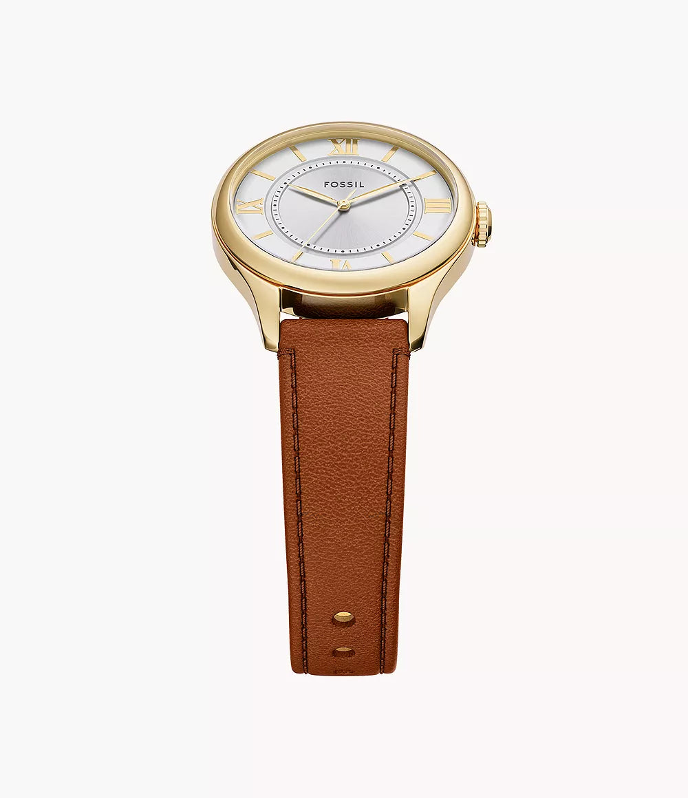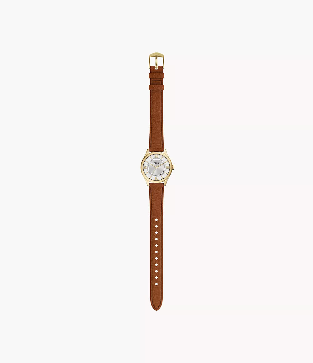 A gold-tone stainless steel case surrounds a silver satin sunray dial, creating a balanced and refined design. The brown leather strap adds warmth, contrasting subtly with the polished gold-tone finish. Thoughtful details like a three-hand layout ensure simplicity and ease of use, while the small, round case enhances its understated appeal.