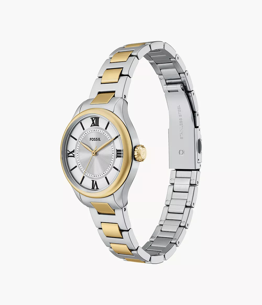 This two-tone stainless steel watch features a silver-tone sunray dial with a satin finish, paired with a gold-tone and silver-tone stainless steel bracelet for a polished contrast. The small, round case maintains a refined and understated profile, complemented by the clean three-hand design. Thoughtful detailing and quality materials make this timepiece a versatile and stylish everyday accessory.