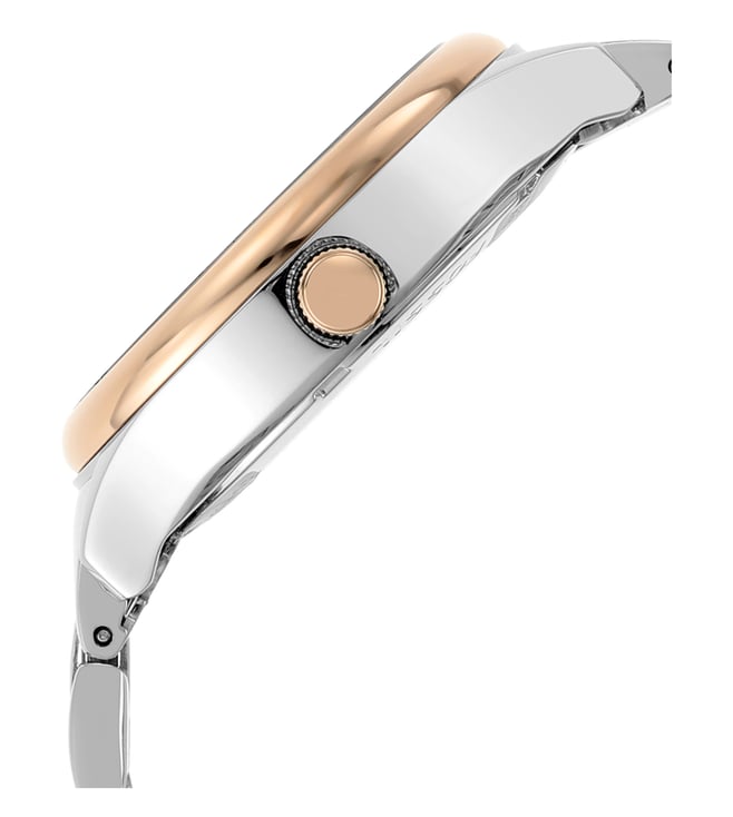 Look modish by donning this womens analog watch from FOSSIL. The silver round dial is protected by a mineral glass. The stainless steel strap comes in a two tone hue that further elevates the look of the timekeeper. Besides, it is completed with a fold-over push button clasp with safety clasp to ensure a secure fit on the wrist.