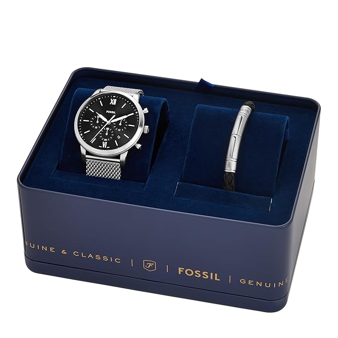 This set features a 44mm Neutra chronograph watch and a black leather multi-strand bracelet.Fossil Neutra is a sleek 44 mm chronograph watch designed with meticulous precision and a stylish leather multi-strand strap. Crafted for functionality and fashion, it effortlessly exudes confidence and charm. Elevate your ensemble and make a statement with this stylish timepiece.