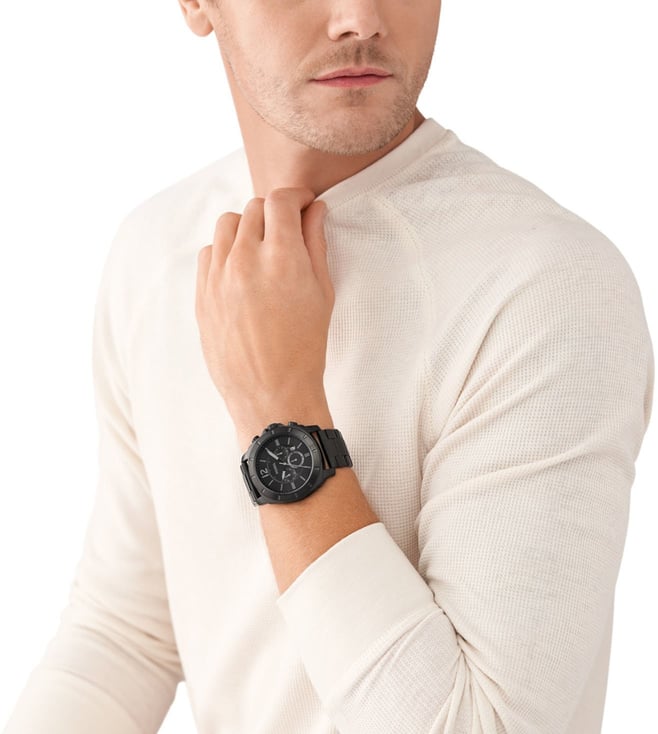 A classy look in a contemporary frame is what perfectly defines this men's analog watch from FOSSIL. The black round dial is protected by a mineral glass. It has a crown for time adjustment. The stainless steel strap comes in a black hue that further elevates the look of the timekeeper. Besides, it is completed with a fold-over clasp to ensure a secure fit on the wrist.