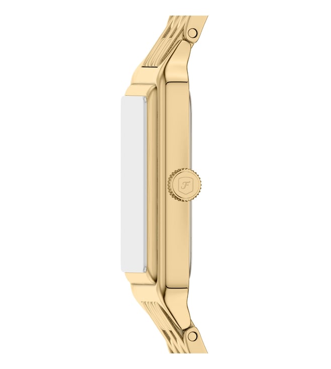 A rectangular gold-tone stainless steel case pairs with a matching bracelet for a sleek, cohesive design. The satin green dial adds a refined pop of color, featuring a clean three-hand display and a convenient date window. Finished with a two-pusher foldover clasp, this watch combines thoughtful details and high-quality materials for a polished, everyday accessory.