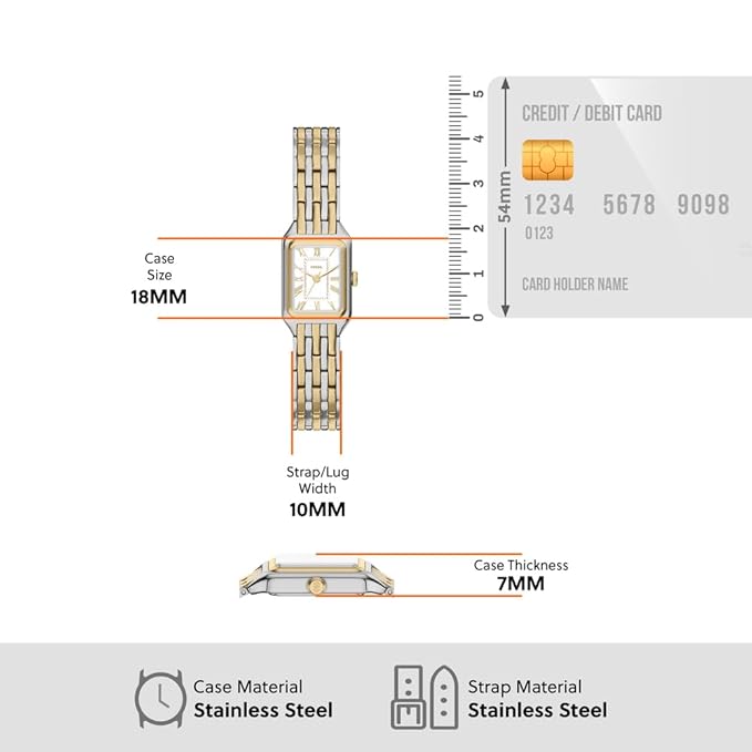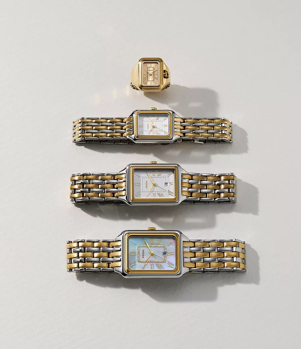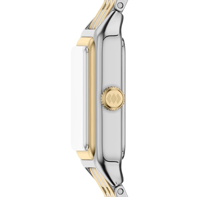 A two-tone stainless steel case and bracelet blend silver and gold-tone finishes for a versatile and polished look. The small rectangular silver-tone case frames a white satin dial, accented with clean three-hand movement for understated detail. Designed with a double press deployant buckle, the bracelet ensures a secure and comfortable fit.