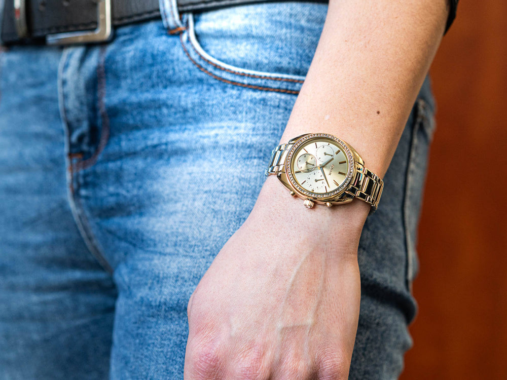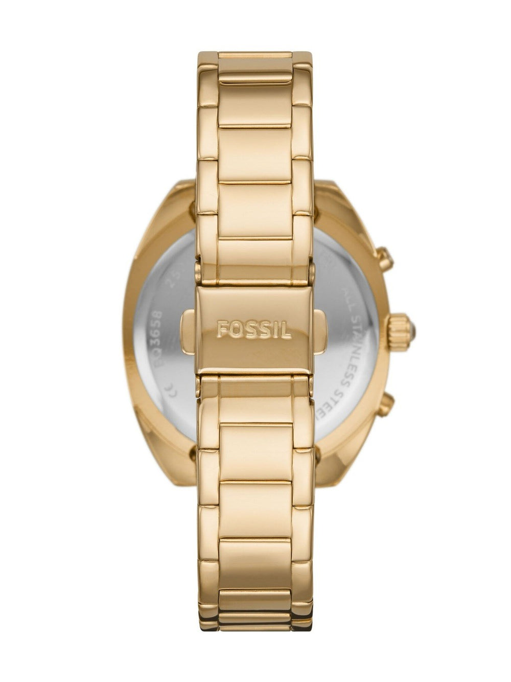 Designed for the lover of all things classy and lavish, this Vale Gold Watch from Fossil is crafted with thoughtfulness for the women who wish to keep a track of time with elegance. This 34mm timepiece features an exquisite gold sunray dial, chronograph movement and a gold-tone stainless steel bracelet. Water resistance upto 50M, this versatile timepiece can be perfectly paired with your casual as well formal attires.