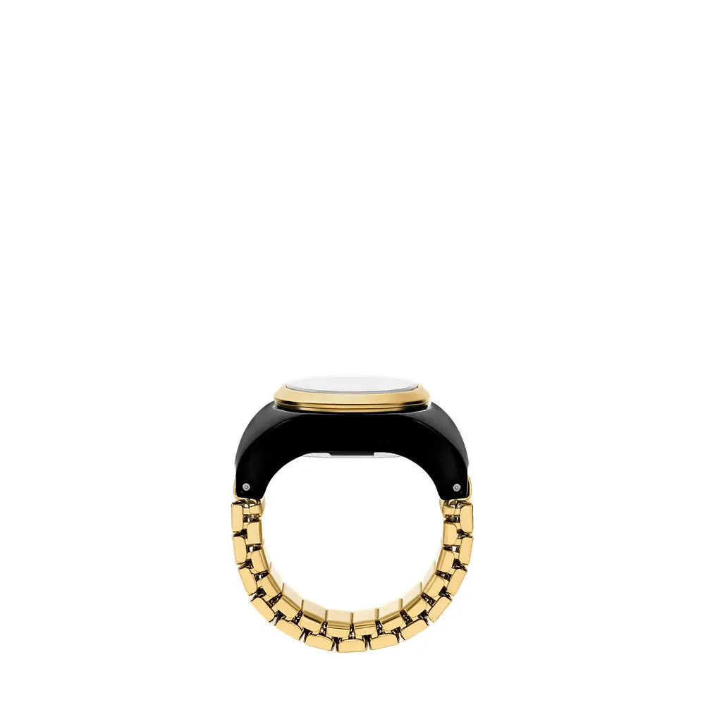 An elegant statement piece that balances sophistication and playfulness. This gold-tone and black enamel stainless steel watch ring is encased in a petite round case. Wear it solo for a minimalist look, or stack with other rings for a bolder style.