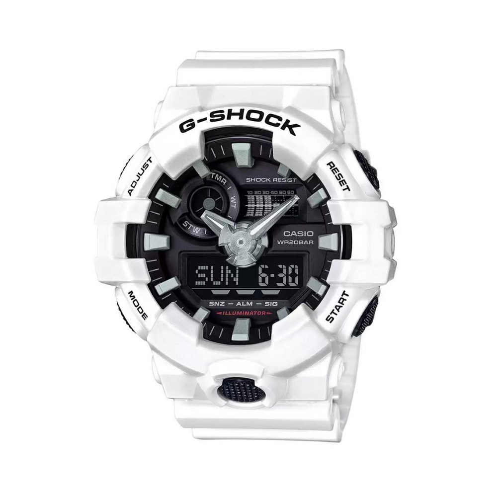the watch brand that is constantly setting new standards for timekeeping toughness, come new colors for the analog-digital GA-700. These new standard G-SHOCK GA-700 models use original resin molding technology that makes it possible to form analog hands and multi-dimensional dial in a choice of two new colors: blue or white. These colors go well with trainers, parkas, and other typical street fashion items. ? Super Illuminator ? Stopwatch with Target Time alarm ? Hand shift feature