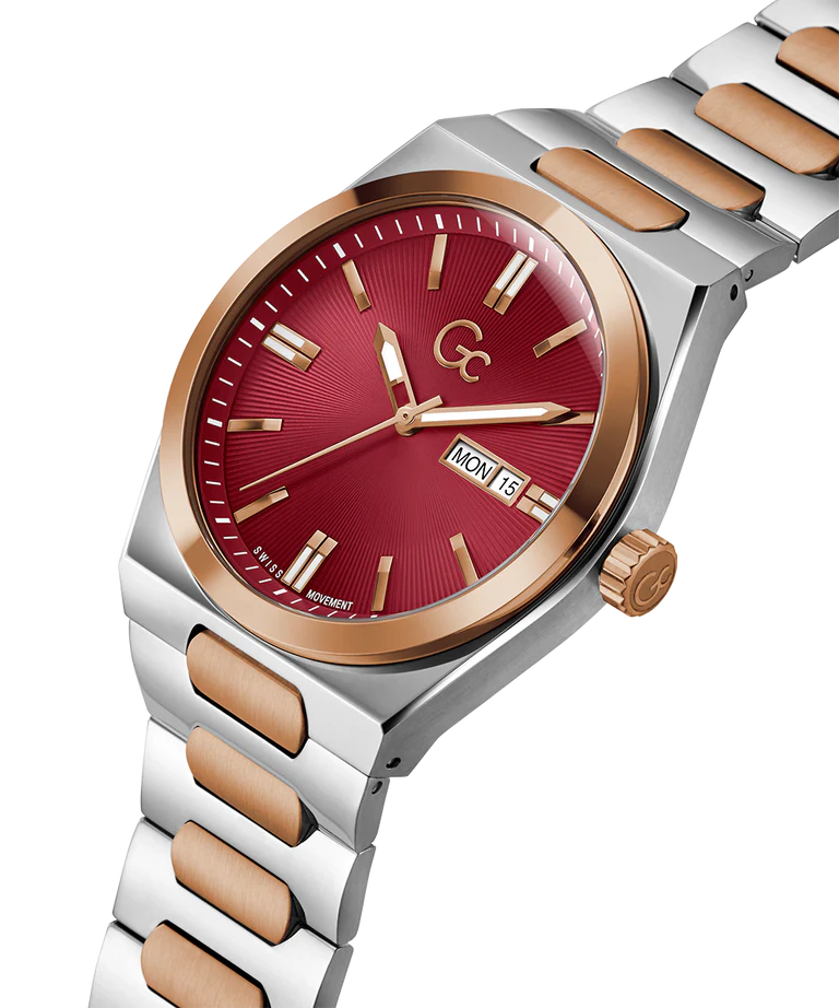 Showcase a sense of contemporary elegance with Gc Prodigy in size 42mm, featuring simply sophisticated lines and a deep textured dial in berry red with visible day/date swiss made movement at 3 o'clock, on a rose gold and silver two-tone version.
