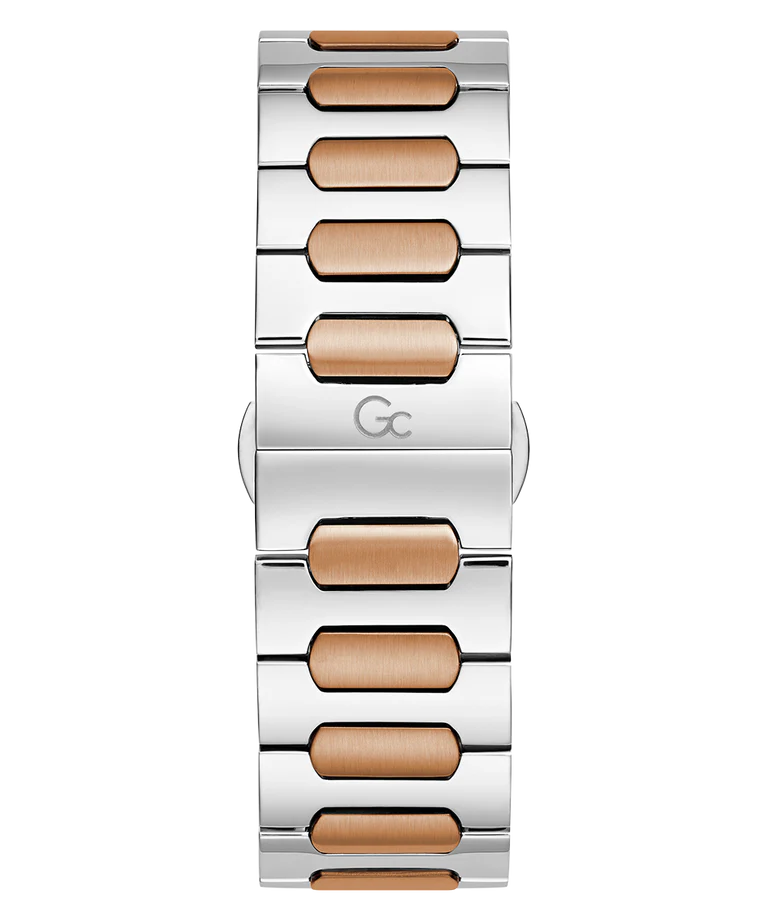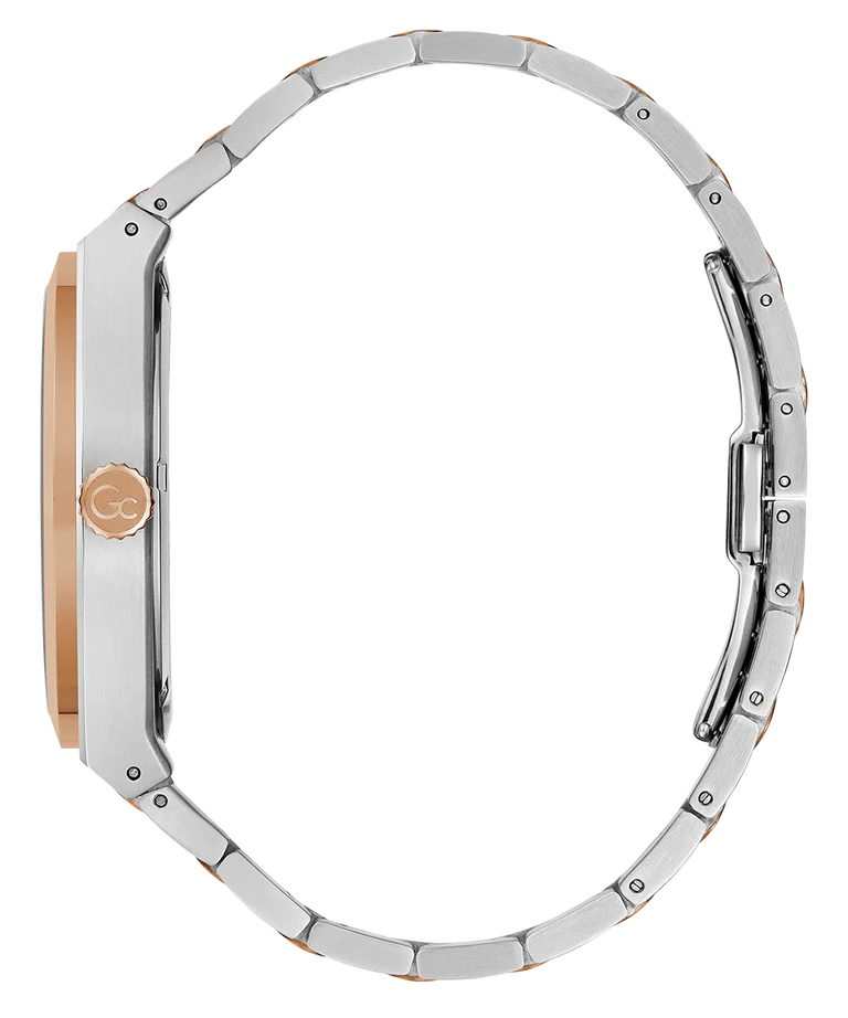 Showcase a sense of contemporary elegance with Gc Prodigy in size 44mm, featuring simply sophisticated lines and a highly detailed black dial with multifunction movement, on a rose gold and silver two-tone version.