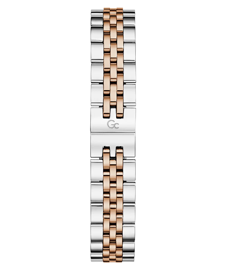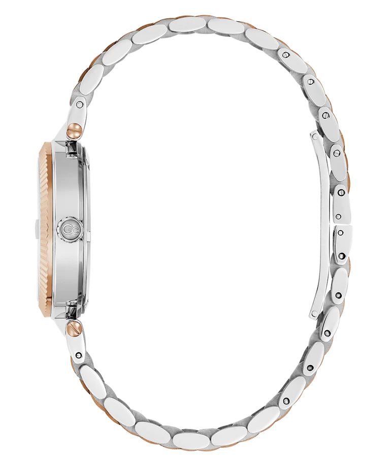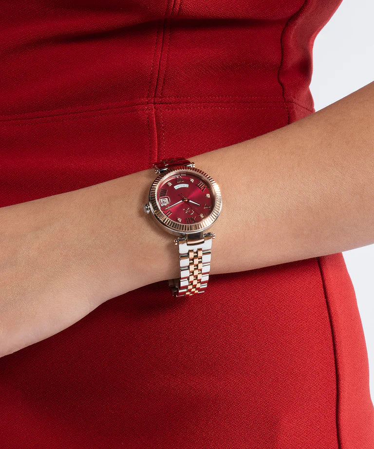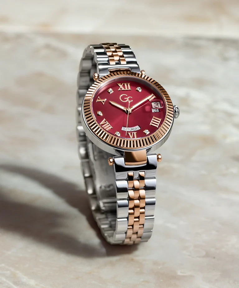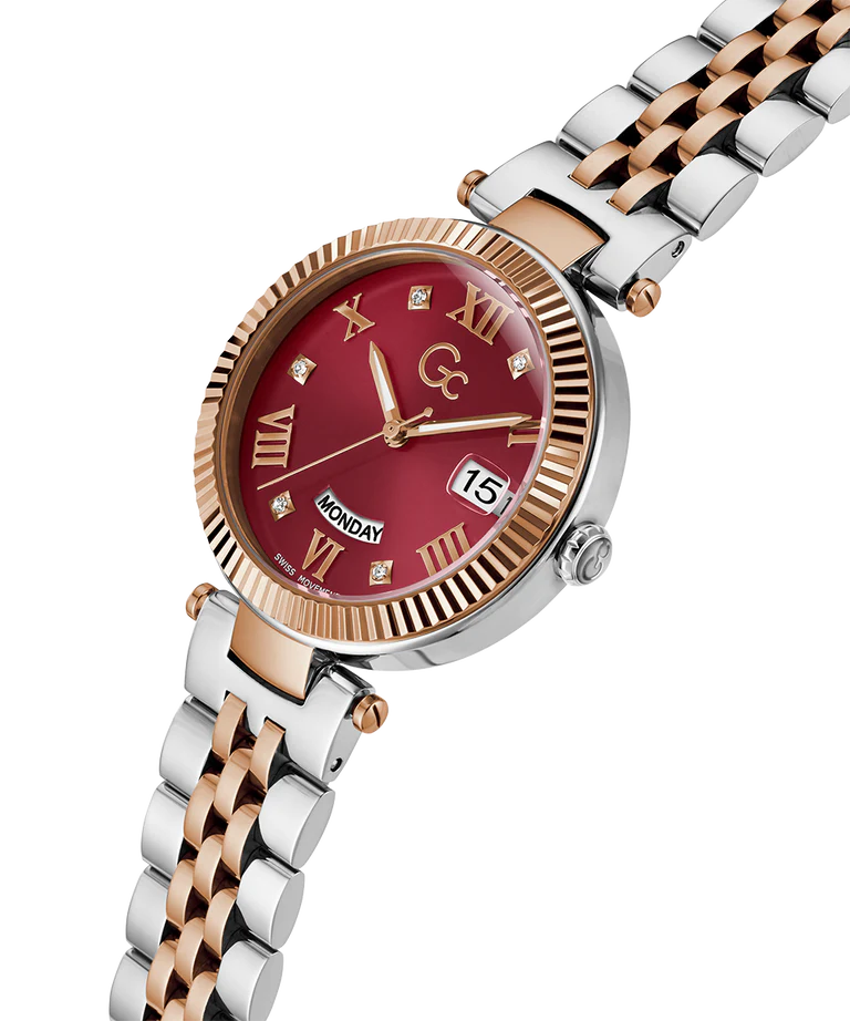Add a touch of refinement to your everyday wardrobe with the Gc Flair. It has a distinctive notched bezel and a comfortable, supple five links bracelet and, for this rose gold and silver two-tone version, an eye-catching berry red sunray dial, with a visible day date swiss movement through windows at 3 and 6 o'clock.