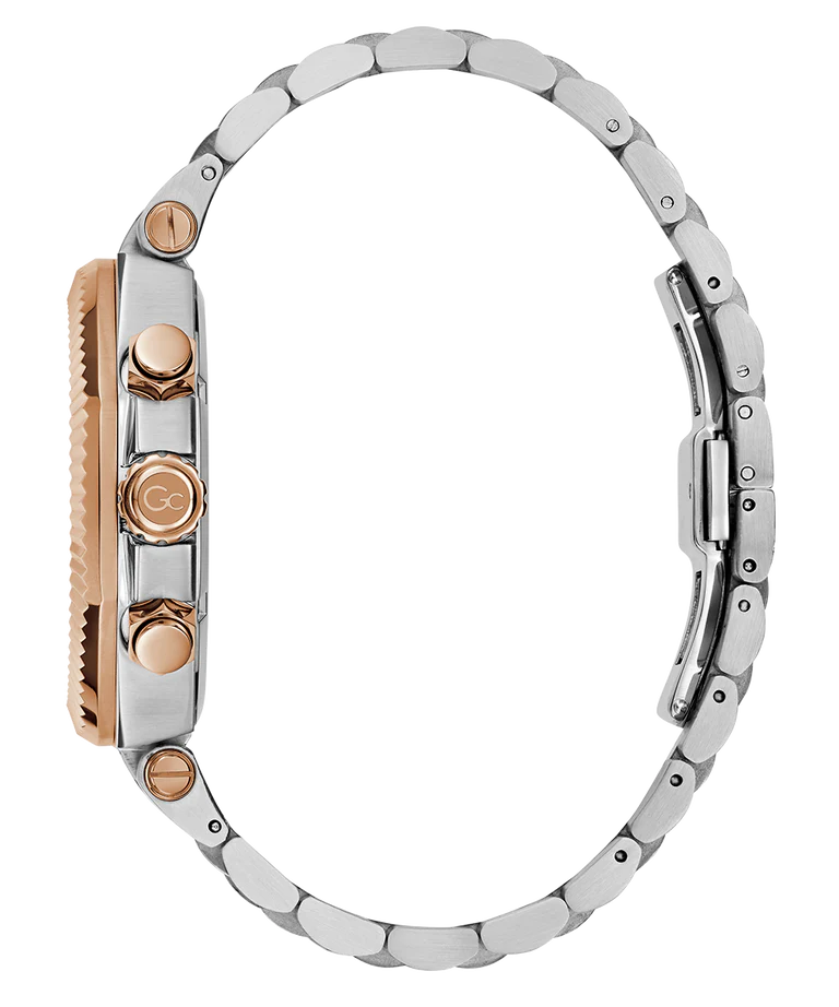 The Gc Atlas Chrono strikes a commanding presence with its sculptural blend of polished silver and rose gold plating across a bold 44mm case and integrated bracelet. Its brushed and polished finishes play with light and contrast, while the deep blue textured dial adds a touch of daring sophistication.