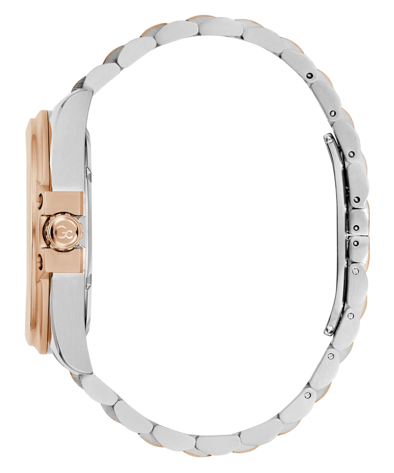 Command attention with the distinguished Gc Bolt. This 43mm timepiece combines striking silver with rich rose gold tones, featuring the collection's emblematic wings and signature screws. The deep dark blue sunray dial creates a bold statement, complemented by the day/date display at 3 o'clock. The elevated bracelet with elegant curves ensures both comfort and sophistication - the perfect expression of sporty-chic style for the modern gentleman.