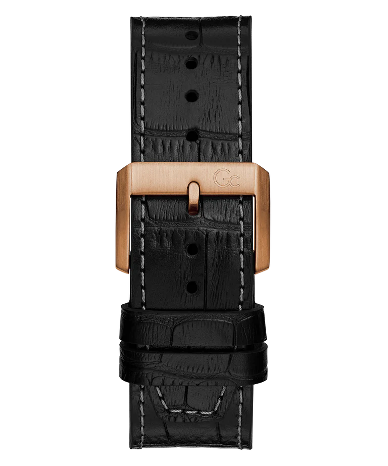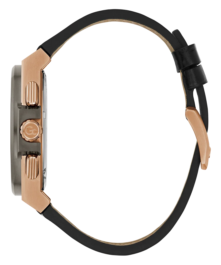 Bold styling and strong character define the male version of the Gc Coussin Shape. Featuring a 44mm case and a highly detailed berry red striped pattern dial, this chronograph exudes a premium horological mastery. The screw design details on the bezel harmonize with the elevated aesthetic, while the rose gold tone case with gun top ring and the eco-friendly black croco-patterned strap create a striking look tailored for the fashion-conscious man of today.