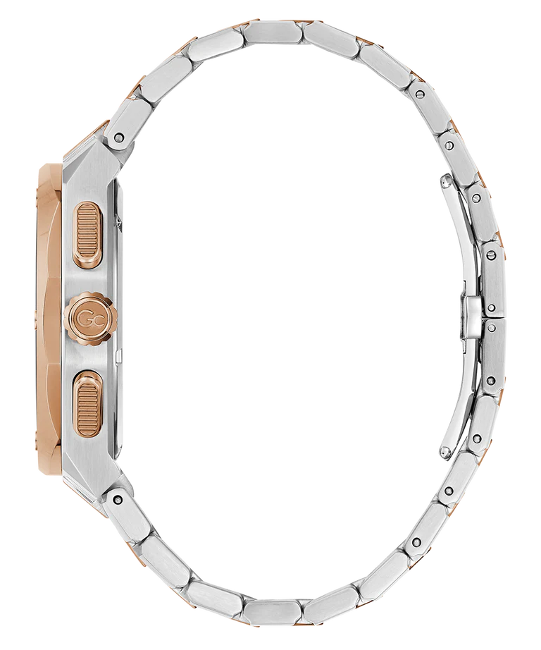 Adopt bold masculinity with the Gc Fiber and its 44mm case, featuring a genuine carbon fiber insert on the rose gold tone top ring, and an emeral green dial. The structured rose gold and silver two-tone bracelet completes the sport-chic look, adding an assertive touch to this timepiece.
