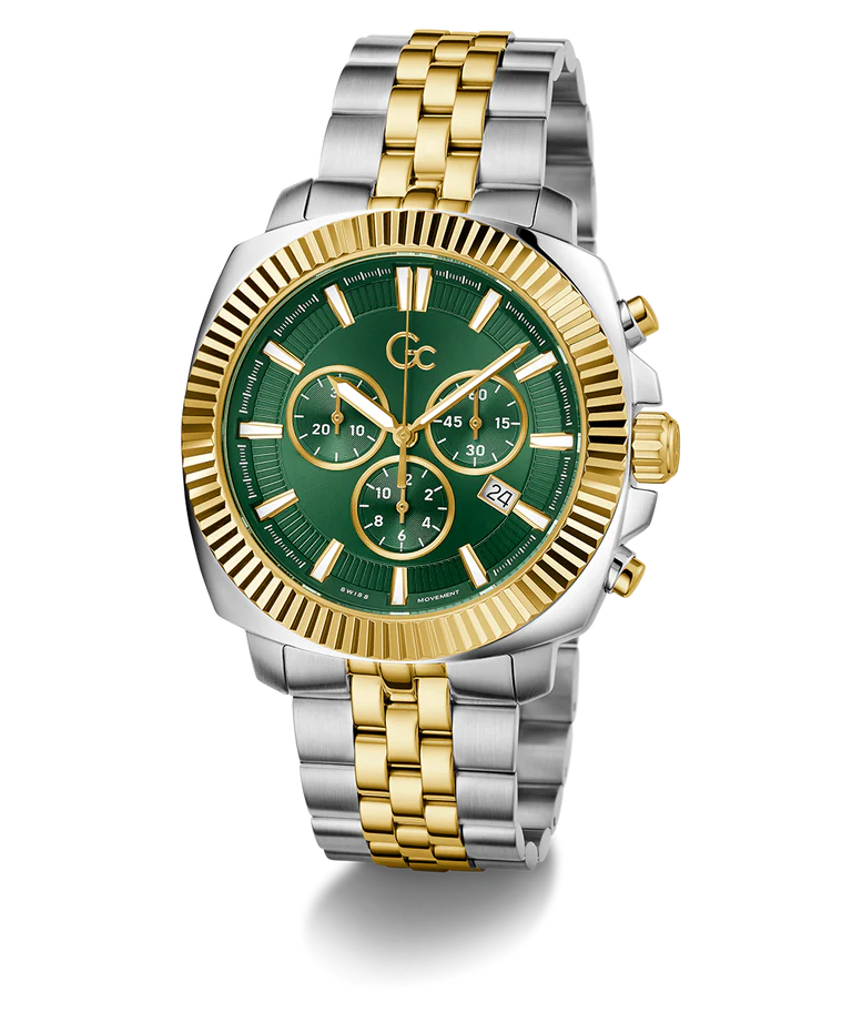 Presented in a stylish design, this men's analog watch from the Flair Coussin collection by Gc will be a great addition to your watch collection. Its stainless steel strap exudes a silver & gold hue that accentuates the look of the watch. Encased in a 44 mm case, the green round dial is functional on a quartz movement. It features chronograph. Besides, it is completed with a deployment clasp with push button clasp to ensure a secure fit on the wrist.