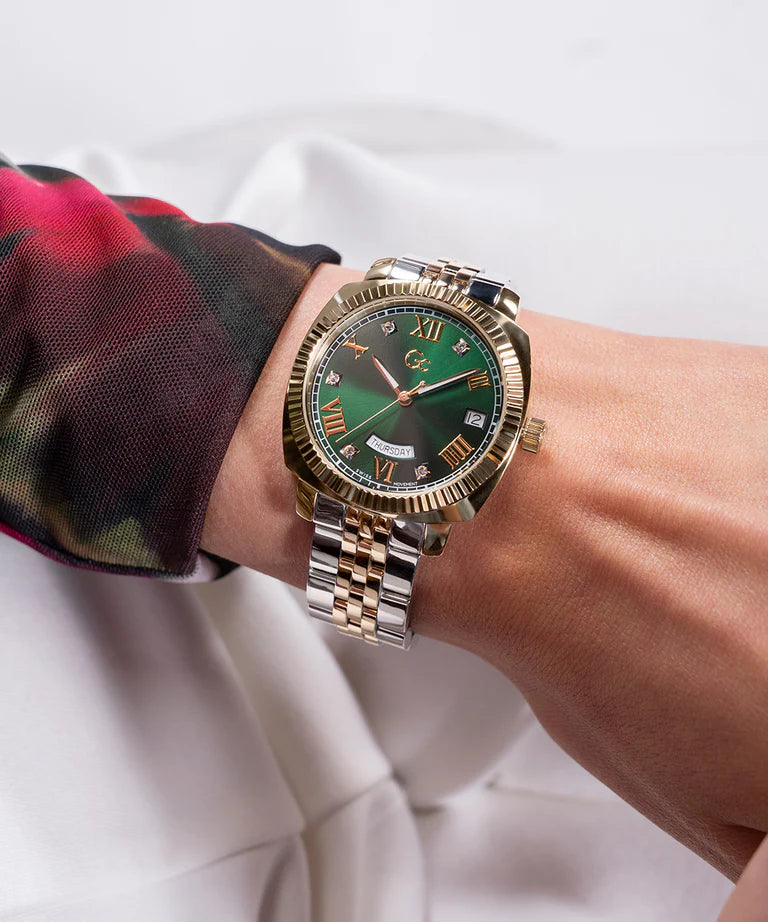 Give a modish look to your wrist by donning this women's analog watch from the Flair Coussin Lady collection by Gc. Secured by a mineral glass, the green round dial is operational on a quartz movement. It exhibits plain three hands. The stainless steel strap exudes a silver & gold hue that accentuates the look of the watch. Moreover, it is equipped with a deployment clasp to ensure a secure fit on the wrist.