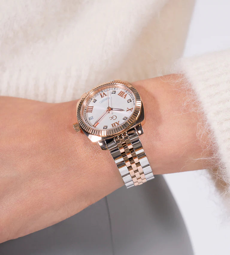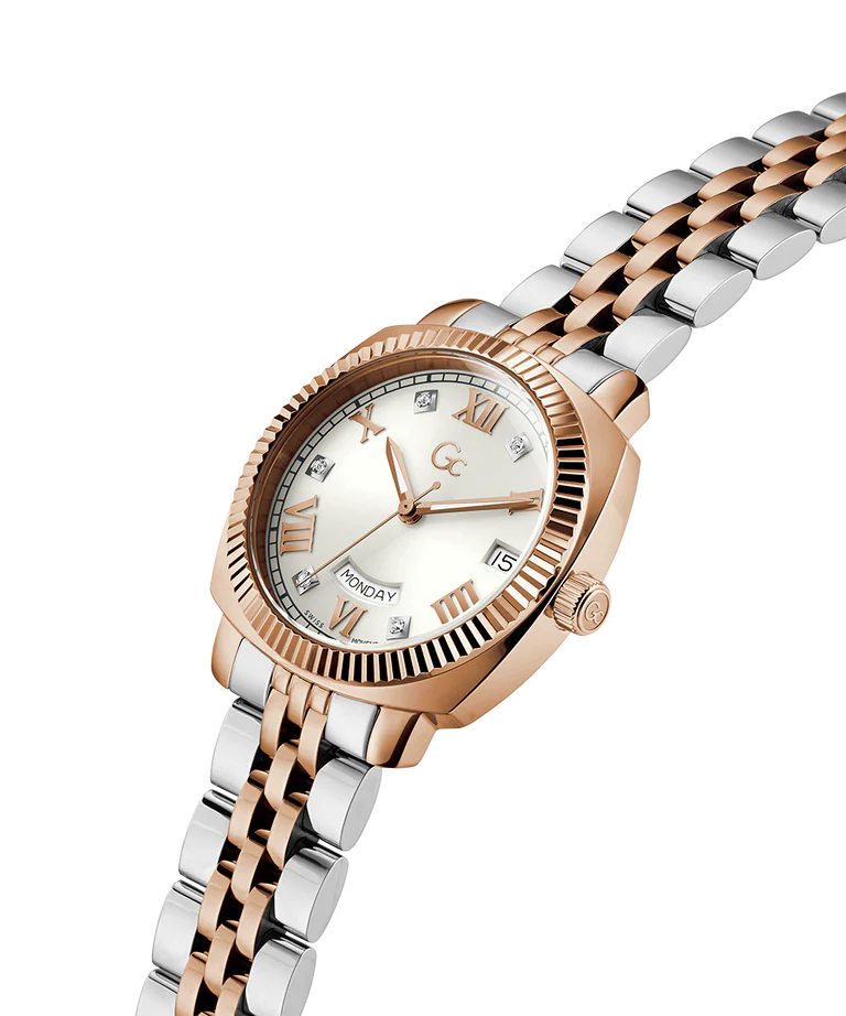 Exhibiting an eye-catching white dial, this women's analog watch from the Flair Coussin Lady collection by Gc is sure to uplift your look. The round dial is secured by a mineral glass and is operational on a quartz movement. It exudes plain three hands. The stainless steel strap vaunts a silver & rose gold hue that enhances the look of the watch. Furthermore, it is completed with a deployment clasp to ensure a secure fit on the wrist.