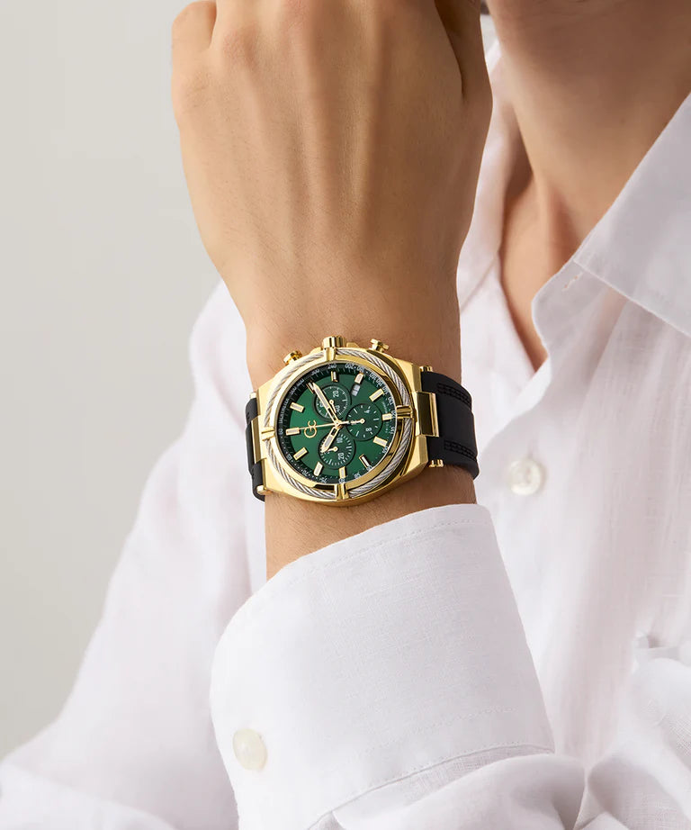 With its unique cable-wire on top ring - the Gc IronClass and its 43mm cushion case and chronograph movement shows a mix of coolness and sophistication. This yellow gold PVD with silver wire version hosts an emerald green dial and features an elegant black silicone strap.