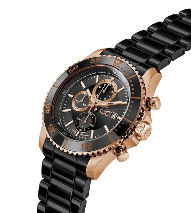 For the stylish men who love to stay atop their style game, this analog watch from the Speedracer collection by Gc is crafted to suit their needs. Safeguarded by a mineral glass and operated by a quartz movement, the black round dial is encompassed in a 44 mm case. It features chronograph. The ceramic strap comes in a black hue that further elevates the look of the watch. Furthermore, it is complemented with a deployment clasp with push button clasp that ensures a secure fit on the wrist.