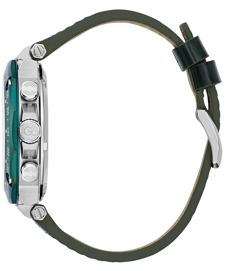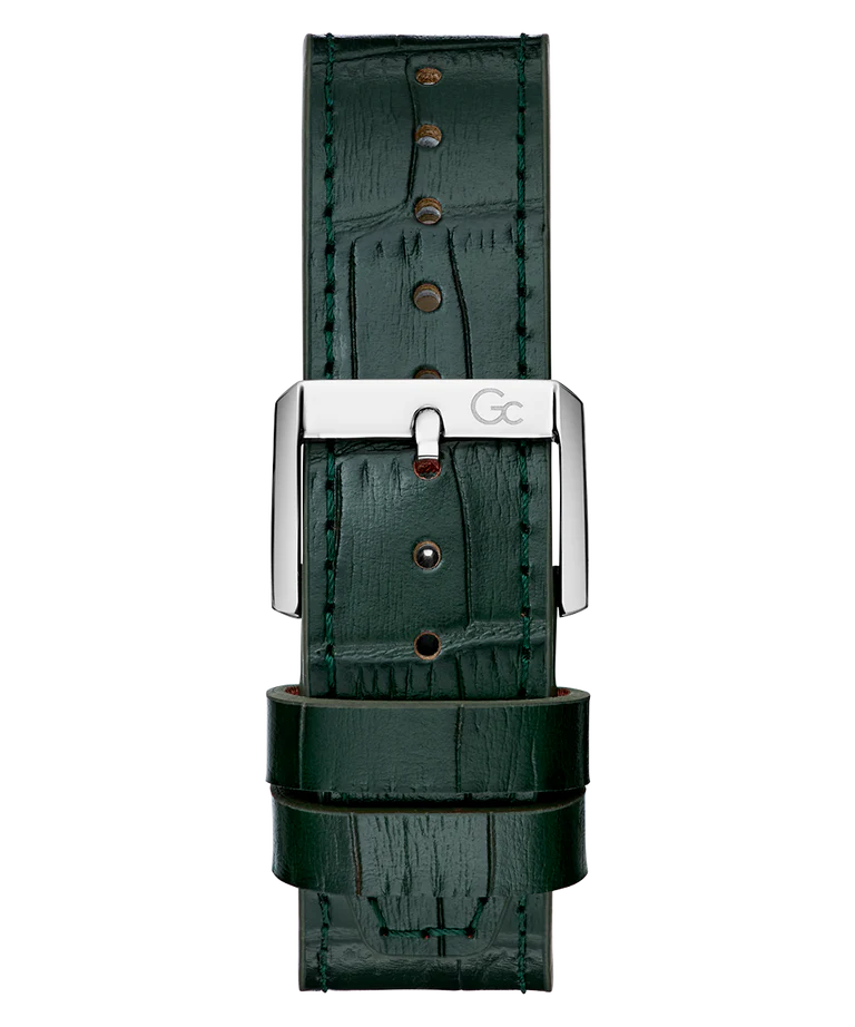 Harness the Gc sporty spirit with this trendy silver and innovative green-tone chronograph. The silhouette of this watch is strikingly masculine, thanks to the square-pattern gun dial with silver and green accents, the multi-faceted bezel enhanced with iconic screw design details, and the croco-pattern green leather strap