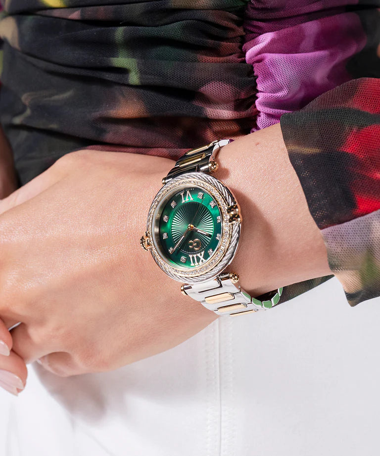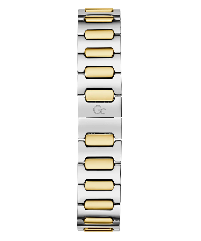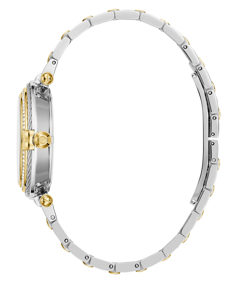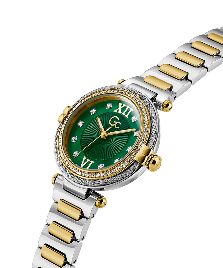 A classy allure for the Gc Vogue Cable, which offers a beautiful case combining the sparkle of genuine cable with the crystals on the top ring, and a radiant eco-friendly green mother-of-pearl dial. The bracelet is elegantly contemporary, making the overall look very sophisticated, in a silver and yellow gold PVD version