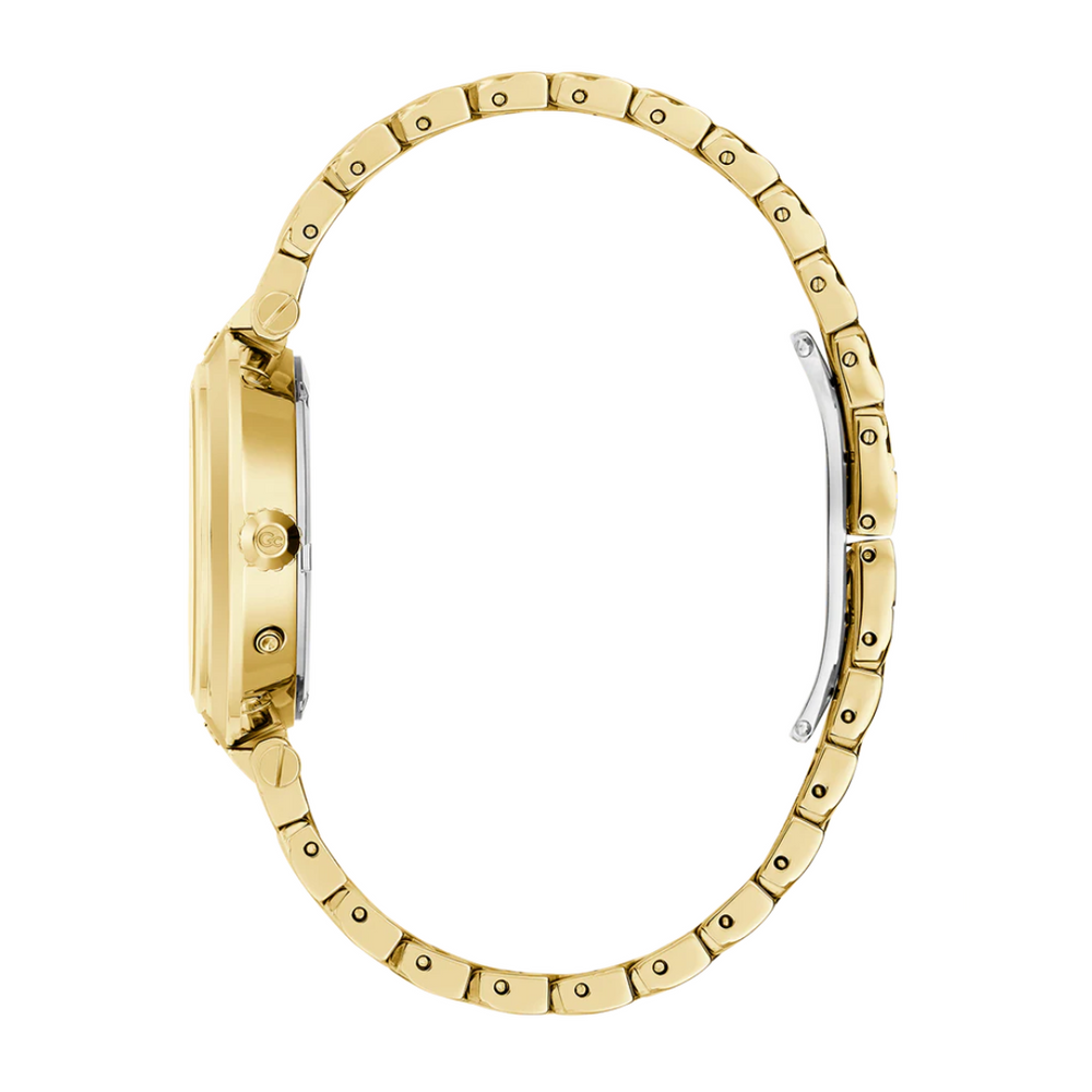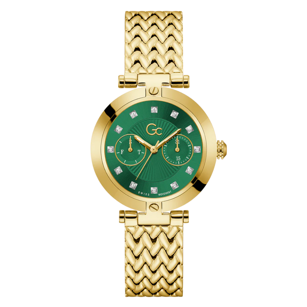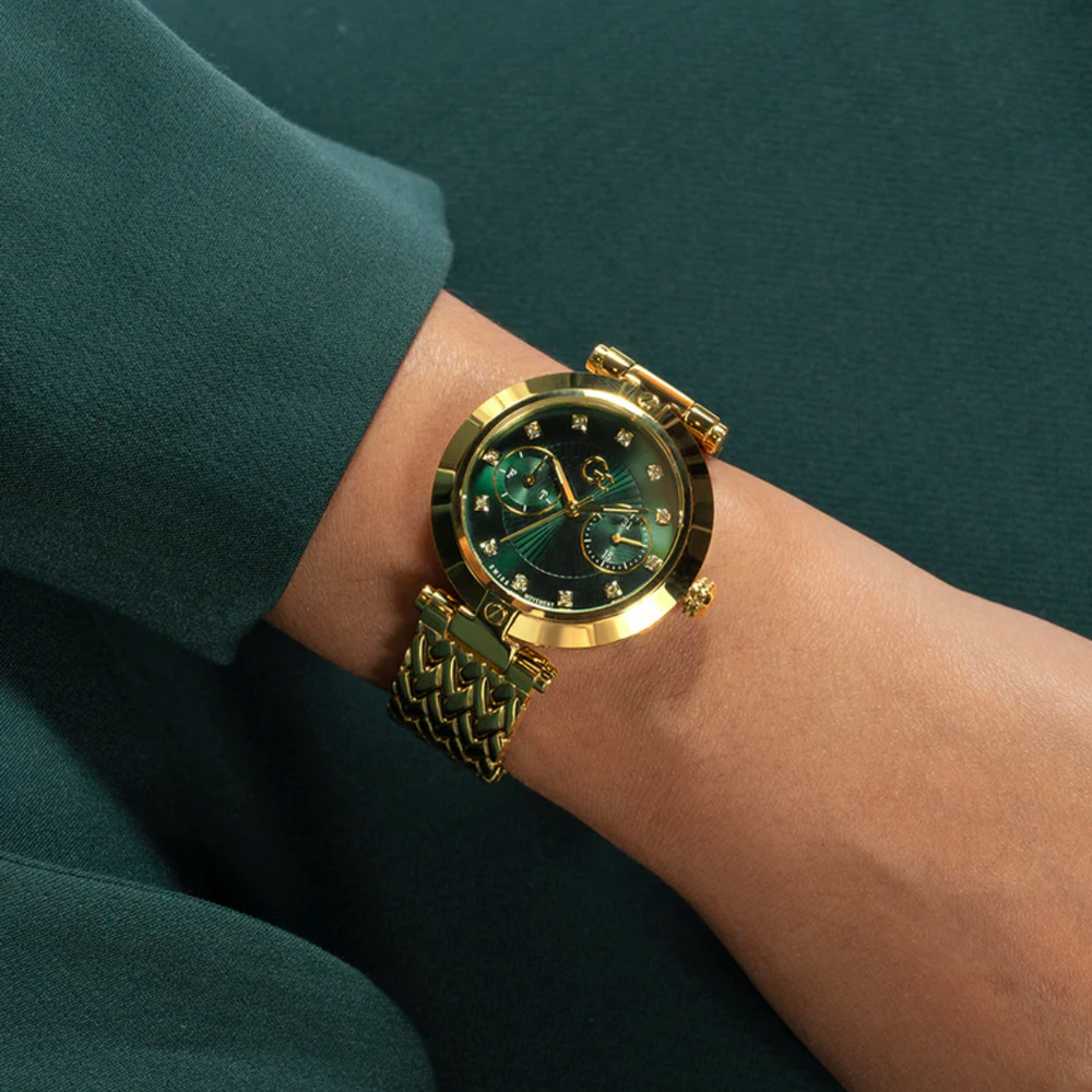 The Gc Vogue features a 36.5mm case and a high-class bracelet with a jewelry touch, all in full yellow gold PVD, and a trendy emerald green sunray dial. It hosts a day/date movement with 2 counters.