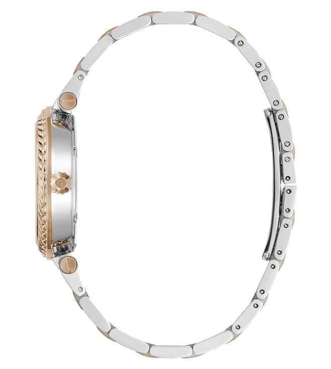 Elevate your femininity with Gc Tiara, with its sleek H-link bracelet and its very detailed textured top-ring, bringing a touch of jewelry to this timepiece. This rose gold and silver two-tone version comes with a white eco-friendly mother-of-pearl dial with rose gold highlights and lovely central pattern.