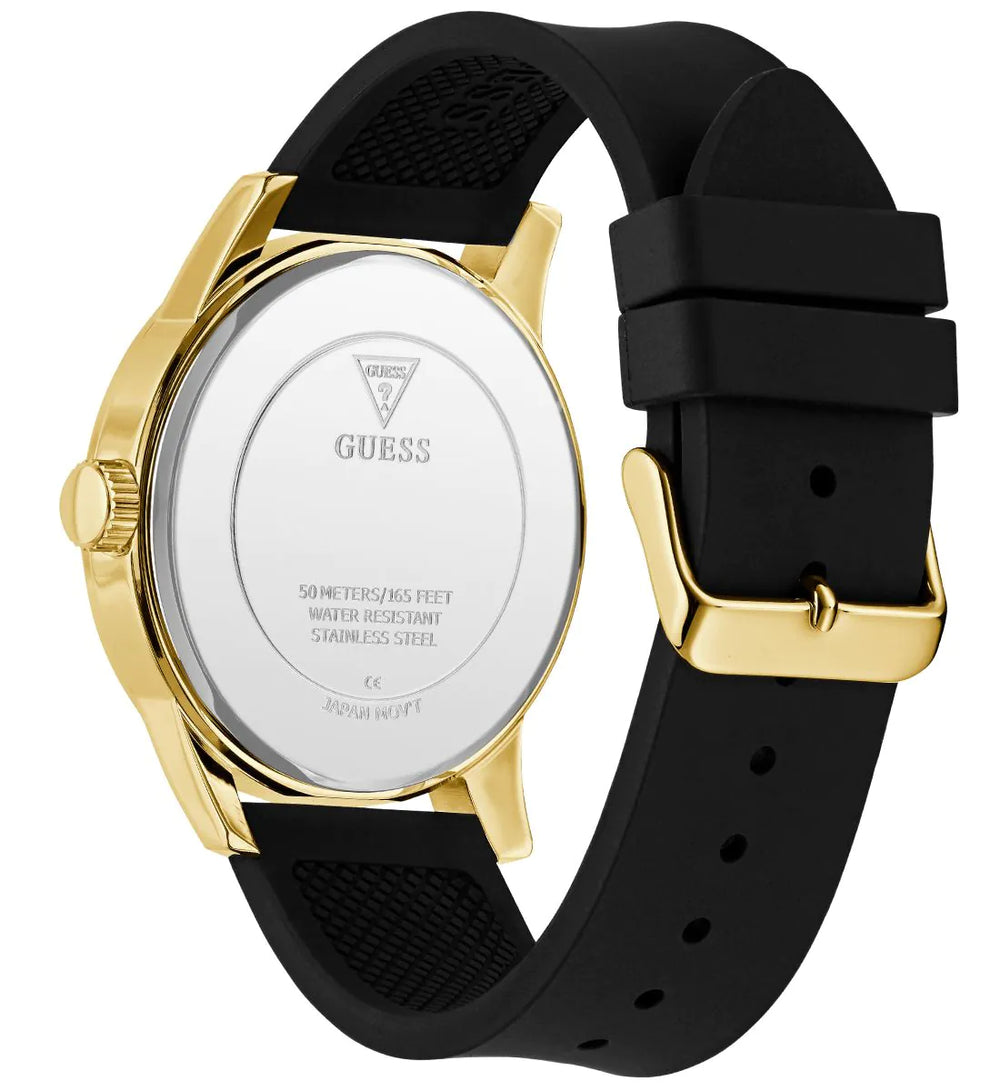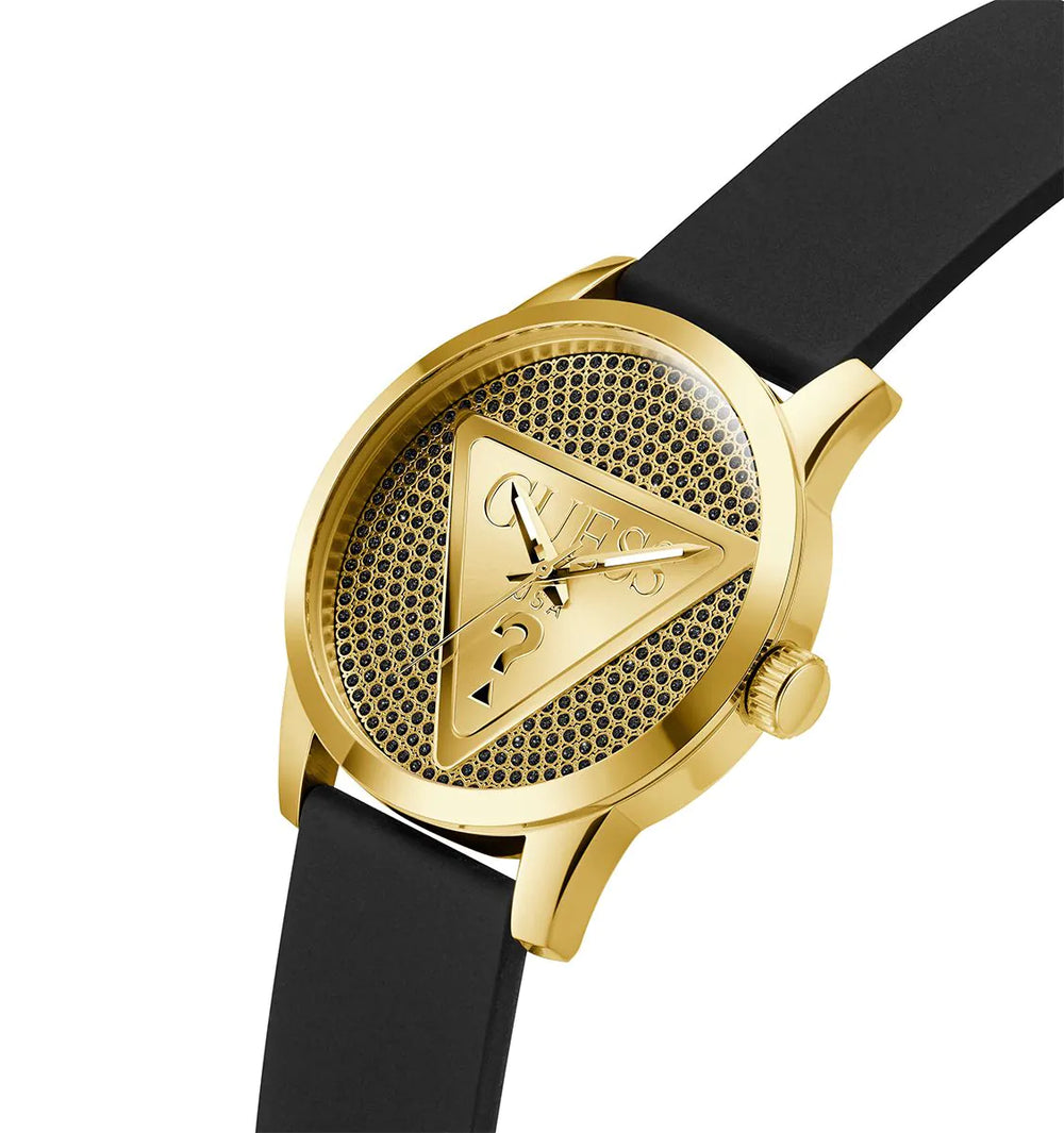 The Guess Bange GW0916G1 women's watch is an attractive choice for elegant women. The 44 mm wide envelope is made of PVD gold-coated stainless steel, which gives it a unique shine. The gold-colored dial, decorated with black crystals, catches the eye and gives character to the watch. Mineral glass covers the dial, ensuring its safety. The watch is equipped with a leather strap in black color, which ensures comfortable wearing. Water resistance of 30 meters makes the watch resistant to minor splashes. This is a beautiful proposition that will perfectly highlight the style of any woman.