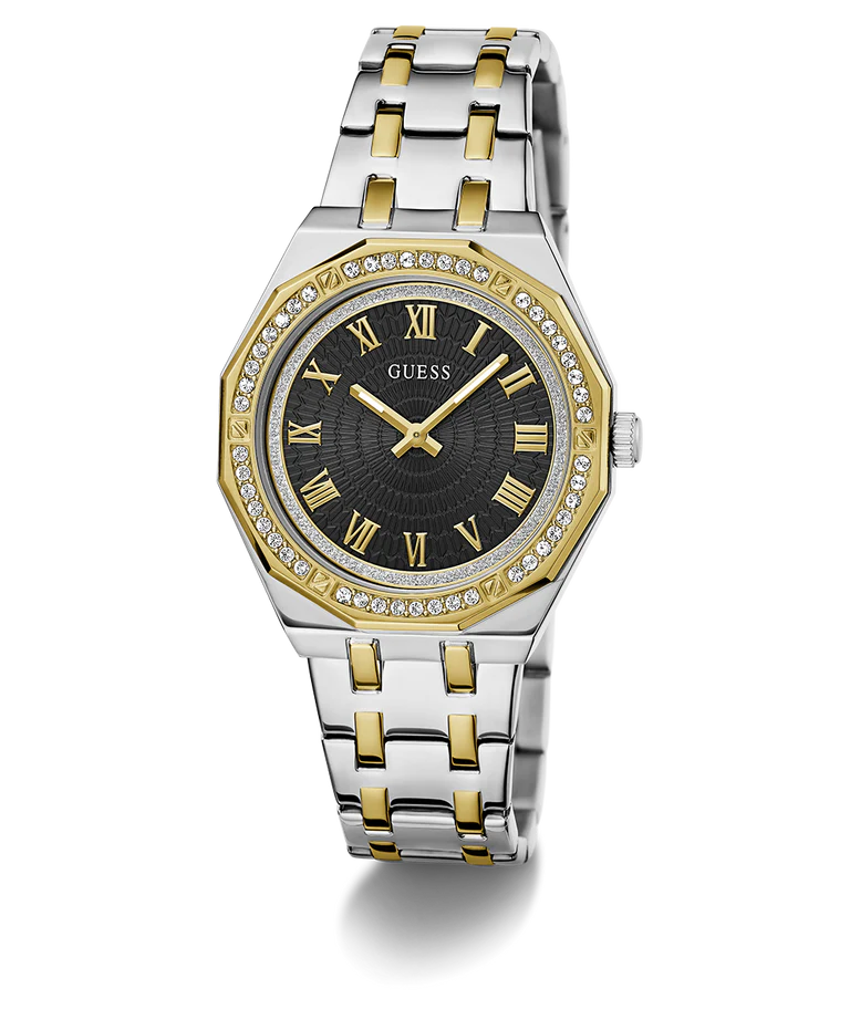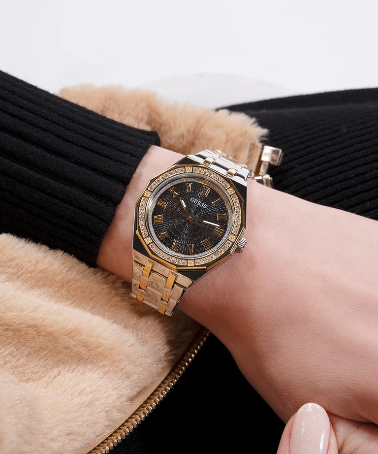 Add a stylish dimension to your look by wearing this women analog watch from Guess. Covered by a mineral glass, the black round dial. It has a crown for time adjustment. The stainless steel strap exudes a multi hue that accentuates the look of the timepiece. Moreover, it is fitted with a fold-over clasp with double push button safety clasp that ensures a secure fit on the wrist.