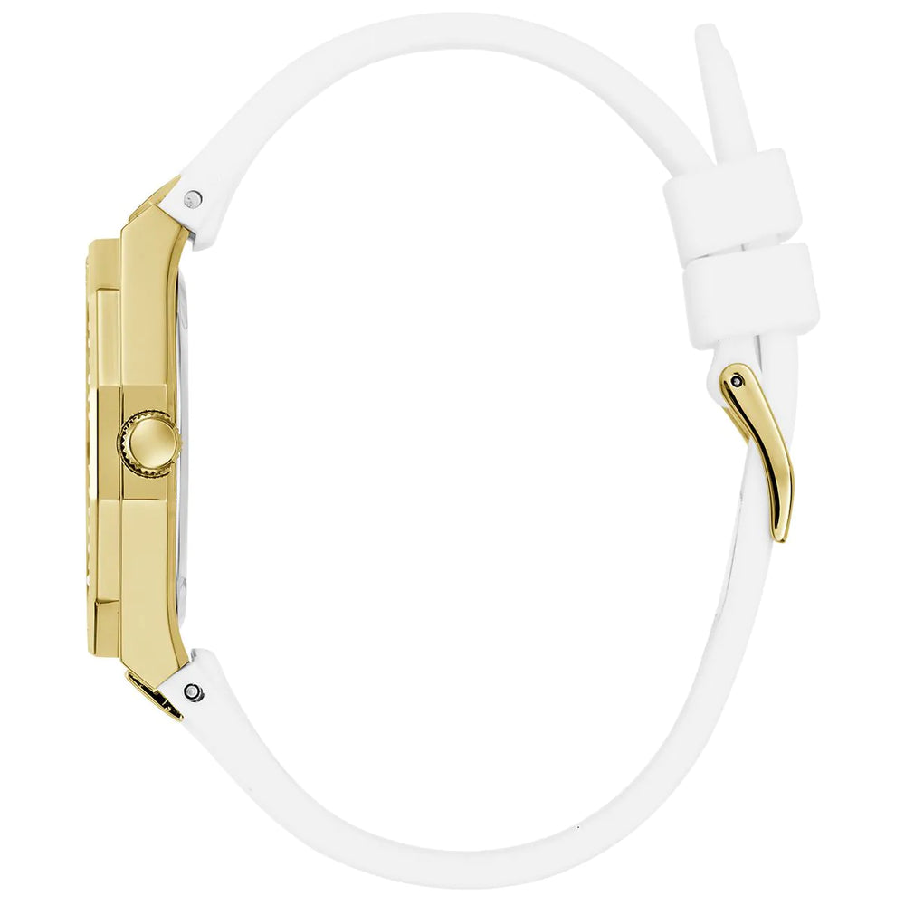 The Guess GW0872L1 women's watch from the Desire series is a unique model that combines modern style with practicality. The gold-colored stainless steel envelope has a diameter of 36 mm, which makes it perfectly suited to a woman's hand. The watch's dial in an elegant green hue is covered by mineral glass, which adds to its character. The white-colored rubber strap is not only comfortable, but also blends well with the whole, creating a cohesive whole. The watch has a water resistance of up to 50 meters, which allows it to be used in various conditions. It is an ideal choice for women who appreciate fashionable design and functionality.