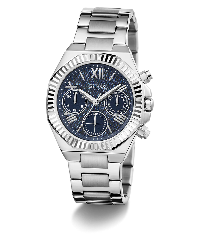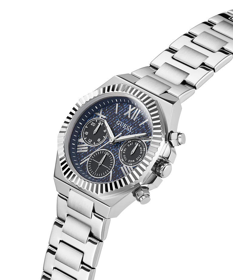 Add a stylish dimension to your look by wearing this women analog watch from Guess. Covered by a mineral glass, the blue round dial. It has a crown for time adjustment. The stainless steel strap exudes a silver hue that accentuates the look of the timepiece. Moreover, it is fitted with a fold-over clasp with double push button safety clasp that ensures a secure fit on the wrist.