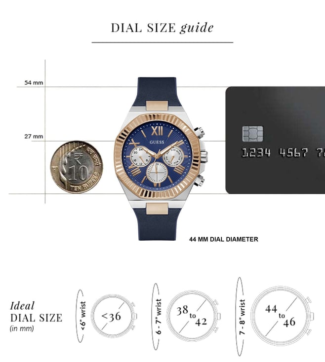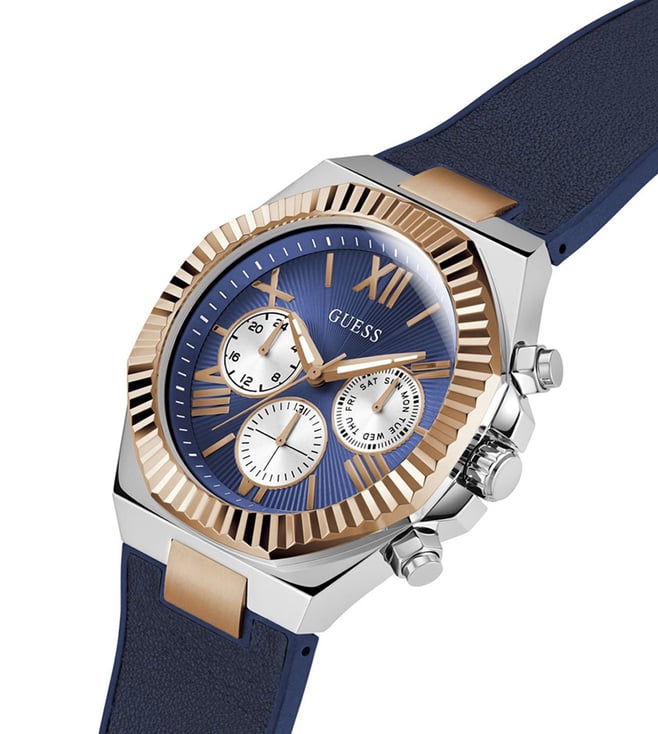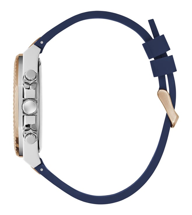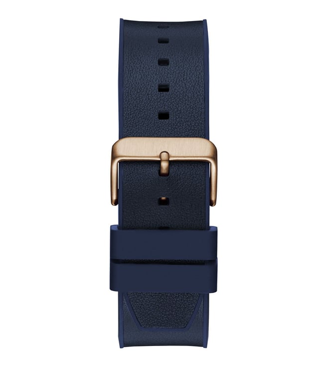 Reflecting the dynamism of modern lifestyles, this men analog watch from Guess will be a great addition to your collection of watches. Secured by a mineral glass, the blue round dial. It has a crown for time adjustment. The genuine leather/silicone strap comes in a blue hue that further elevates the look of the timekeeper. Moreover, it is equipped with a buckle clasp to ensure a secure fit on the wrist.