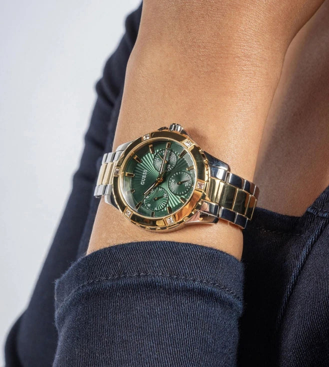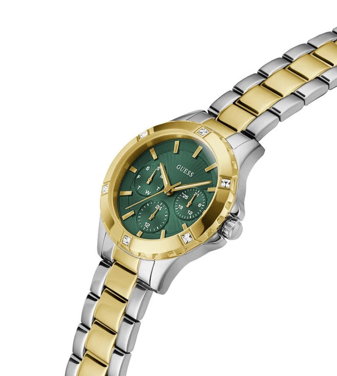 Look modish by donning thiswomen's analog watch from the collection by GUESS. Thegreen round dial is protected by a mineral glass. It features and a crown for time adjustment. The stainless steel strap comes in a two tone hue that further elevates the look of the timekeeper. Besides, it is completed with a pilot buckle clasp to ensure a secure fit on the wrist.