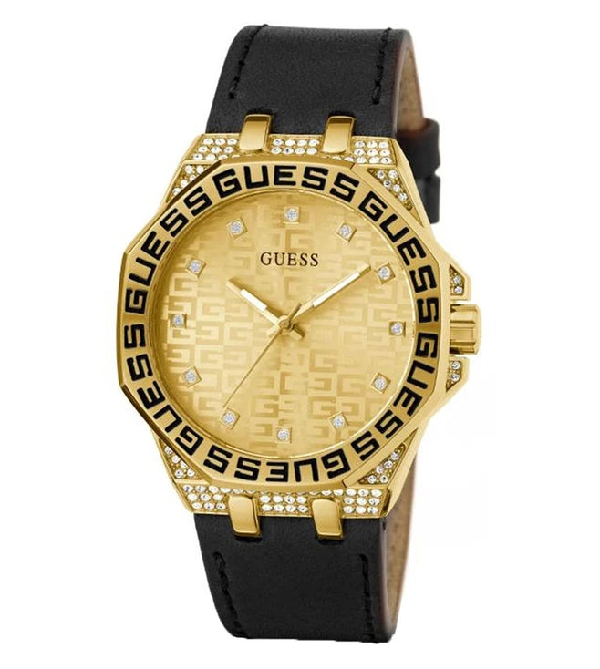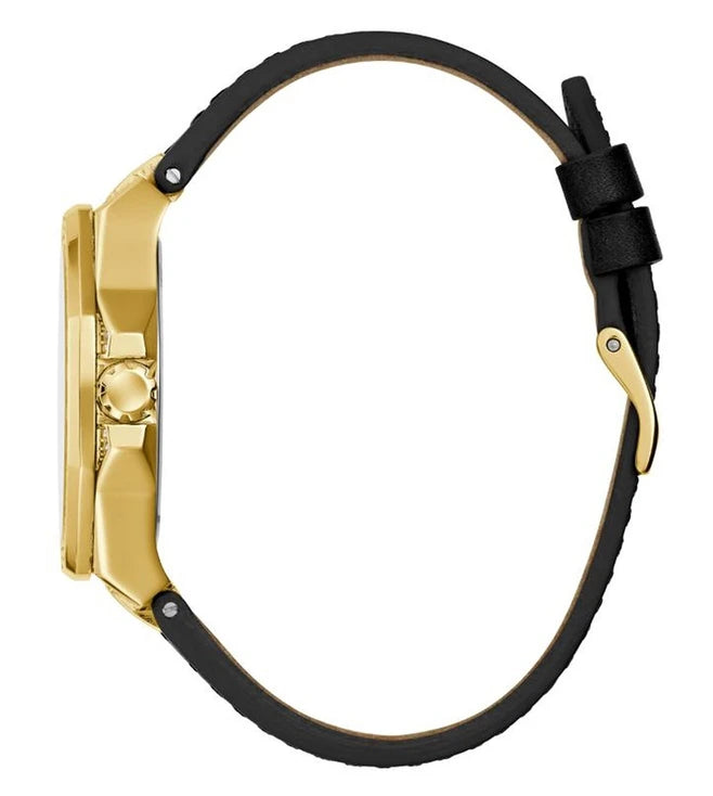 A perfect pick for every watch lover, this women's analog watch from the Insignia collection by GUESS blends functionality with modern-day style. Its genuine leather strap comes in a black hue that elevates the look of the watch. Housed in a 32 mm case, the golden round dial looks quite attractive. It showcases plain three hands and a crown for time adjustment. Moreover, it is fitted with a buckle clasp to ensure a secure fit on the wrist.