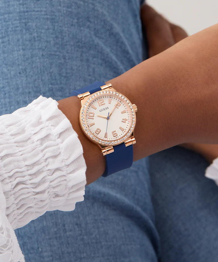 A look to fawn over, this style is sure to be a new staple in your watch wardrobe with a crystal bezel and a smooth silicone strap.
