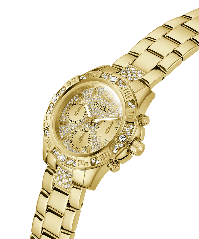 Add a stylish dimension to your look by wearing this women analog watch from Guess. Covered by a mineral glass, the gold round dial. It has a crown for time adjustment. The stainless steel strap exudes a gold hue that accentuates the look of the timepiece. Moreover, it is fitted with a fold-over clasp with double push button safety clasp that ensures a secure fit on the wrist.